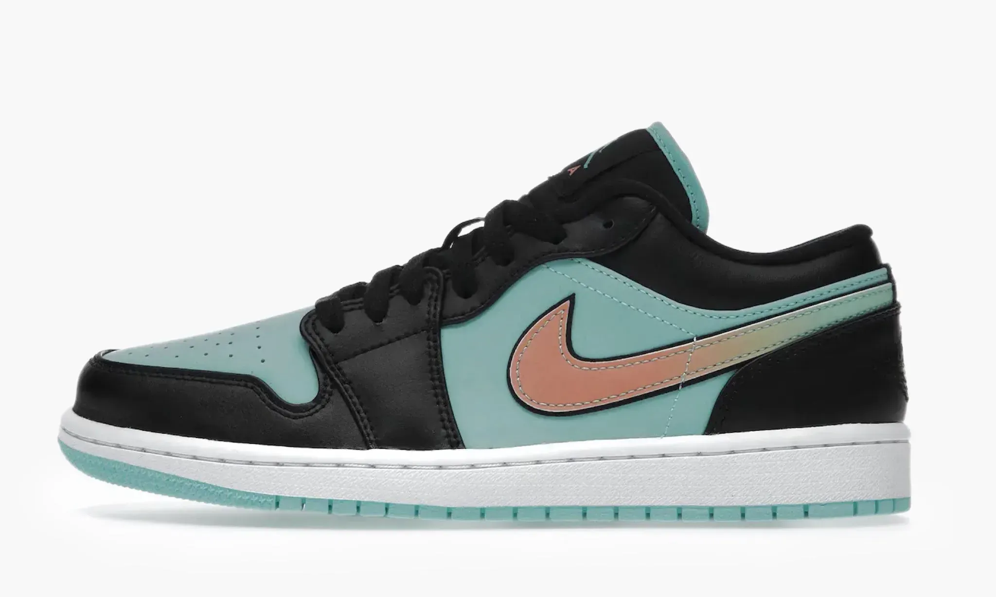 Air Jordan 1 Low SE "Tropical Twist" — это очень интересное прочтение классического силуэта кроссовок, связанного с именами компании Nike и баскетболиста Майкла Джордана. В качестве основного материала для данной модели была выбрана кожа ярко-бирюзового цвета, который часто называют "тиффани". Массивные черные детали, равномерно расположенные по всей площади обуви, слегка сдерживают этот яркий всплеск красок. Оригинальные свуши с окантовкой на этот раз окрашены в персиково-голубой градиент. В этих же оттенках выполнены логотипы "Jumpman" на стельках и нейлоновых язычках. Кроссовки Air Jordan 1 Low SE "Tropical Twist", выпущенные в конце марта 2021 года, готовы каждый день дарить вам комфорт и уверенность в себе.