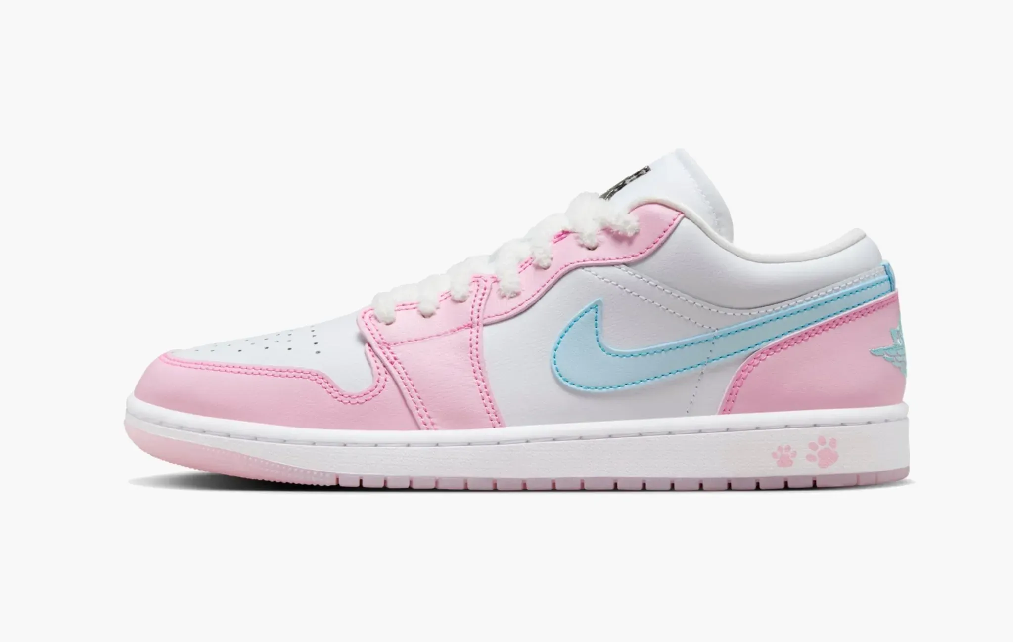 Эксклюзивная женская расцветка Air Jordan 1 Low SE WMNS "Paw Print Pink Foam". Уникальных кроссовок для прекрасного пола просто множество, за это спасибо Jordan Brand. На пяточно части подошвы красуются отпечатки кошачьх лап, что выглядит очень мило. Нежный розовый оттенок, очень похожий на сахарную вату, отлично сочетает с небесно-голубым. Даже про пушистые шнурки не забыли. Завершает эту картину металлический Jumpman на язычке.