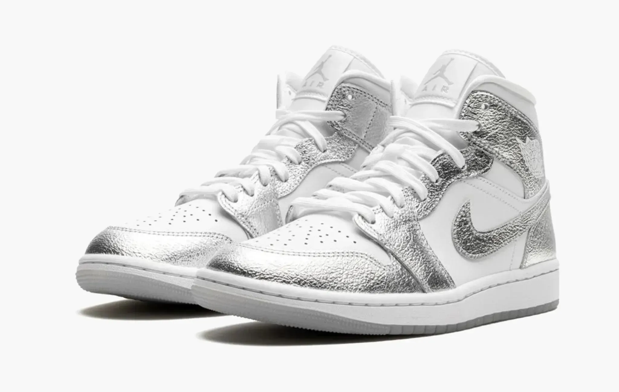 Конечно, мы больше привыкли к кроссовкам Майкла Джордана в цветах команд, в которых он играл. Но сейчас Air Jordan 1 Mid – это холст для дизайнеров, а наше дело – ловить самое интересное. Air Jordan 1 Mid “Crinkled Silver Foil” напоминают обувь Серебрянного Сёрфера из вселенной Marvel. Ключевые фрагменты верха кроссовок выполнены из материала, который действительно похожи на мятую фольгу или серебряные оттиски.
