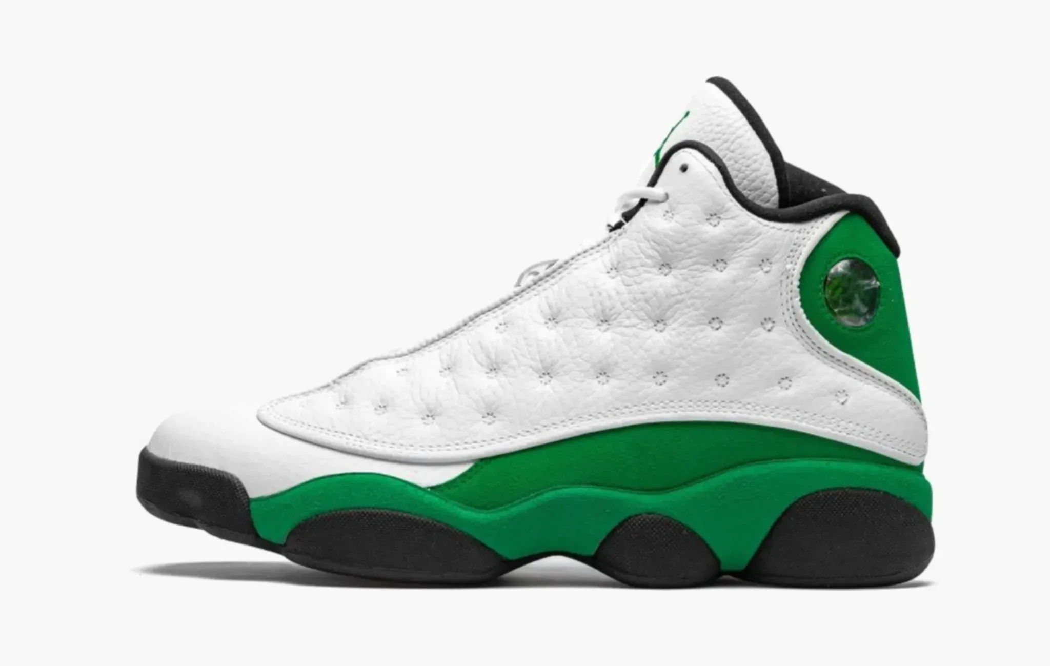 Силуэт прямиком из 1997 года до сих пор выглядит актуальным, в этом вся магия дизайнов Тинкер Хэтфилда. Расцветка «Lucky Green» уже глубоко пробралась во вселенную Майкла Джордана. Сочетание белого, чёрного и зелёного отсылает к одной из величайших команд-соперников MJ в период его карьеры на площадке — «Бостон Селтикс». Мягкая кожа и замша – классика для таких кроссовок. Визуально напоминают ультра-редкие Ray Allen x Air Jordan 13, которые сейчас стоят по несколько тысяч долларов.