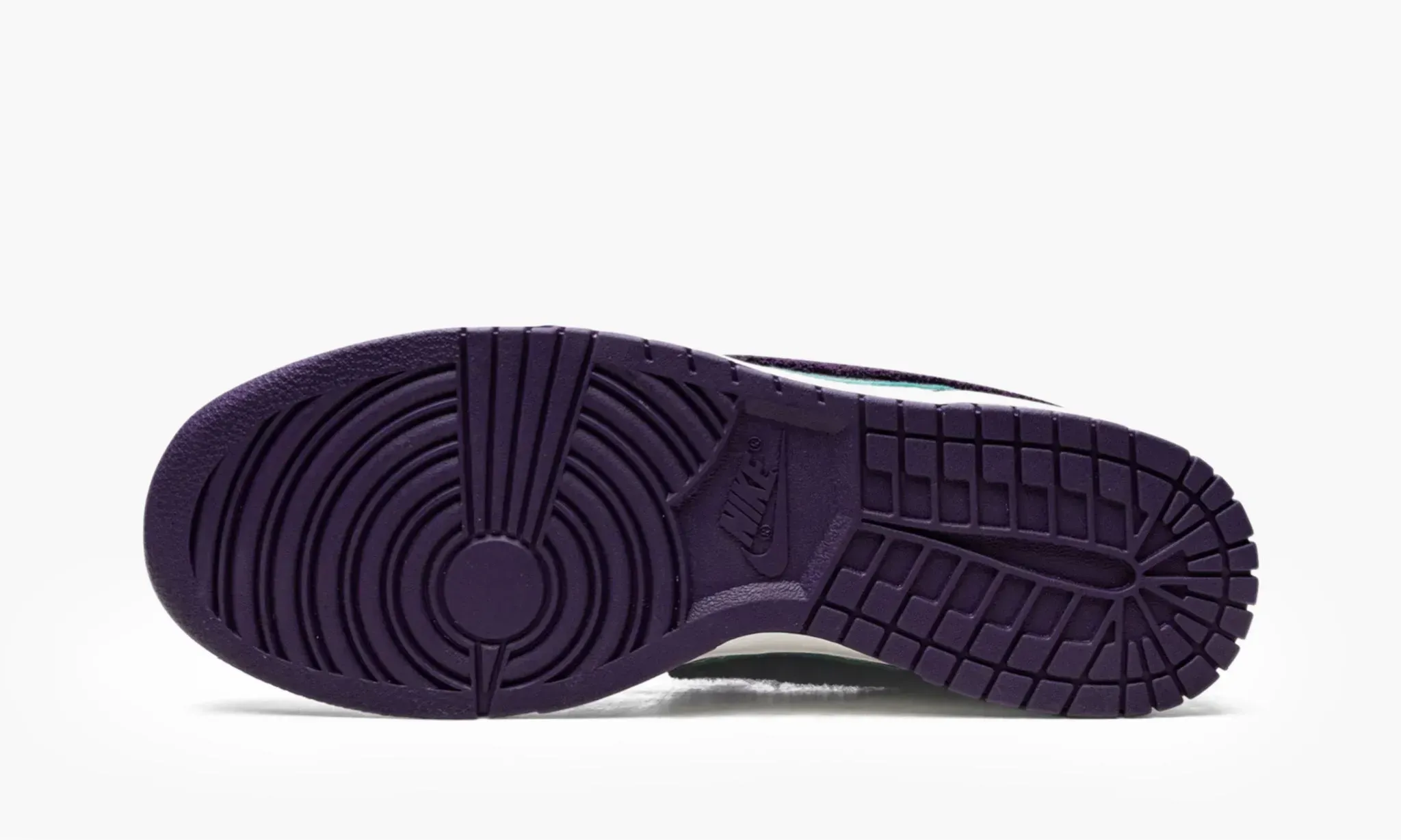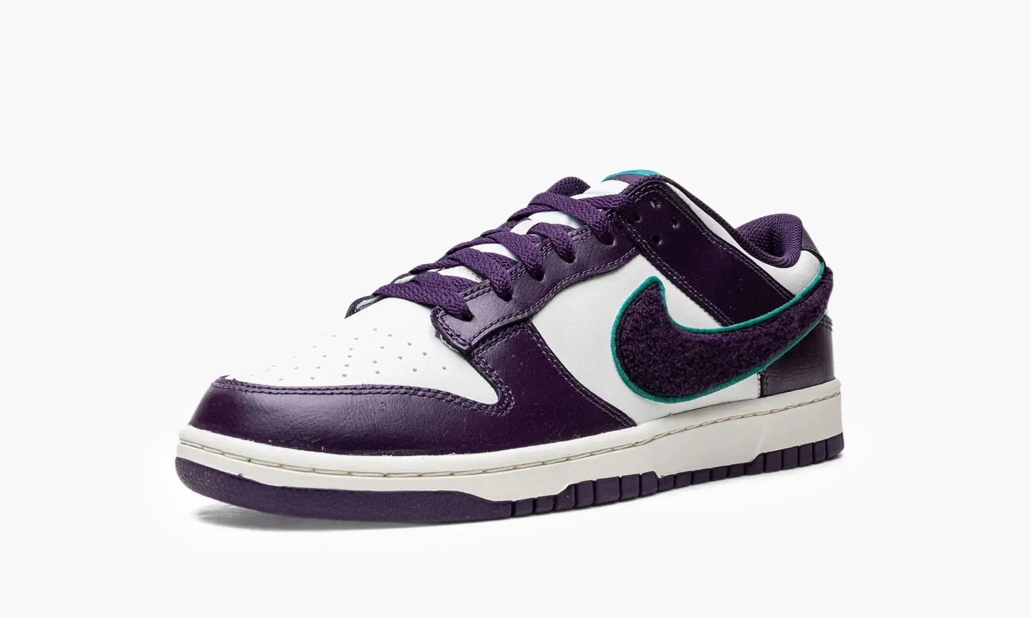 Кроссовки Dunk Low "Chenille Swoosh Sail Grand Purple" могли бы стать базовой парой, если бы не обладали некоторой изюминкой. Белая кожа, послужившая основным материалом для данной модели, на этот раз была дополнена крупными темно-фиолетовыми деталями, равномерно распределенными по всей поверхности обуви. В ментоловый оттенок открашена окантовка свушей, изготовленных из пушистой ткани, а также надписи "Nike" на задниках и брендированных бирках на язычках. Подошва для кроссовок была выбрана классическая: прочная и с глубоким рисунком протектора. Интересные Dunk Low "Chenille Swoosh Sail Grand Purple", разработанные именитой компанией Nike, поступили в продажу в конце сентября 2022 года.