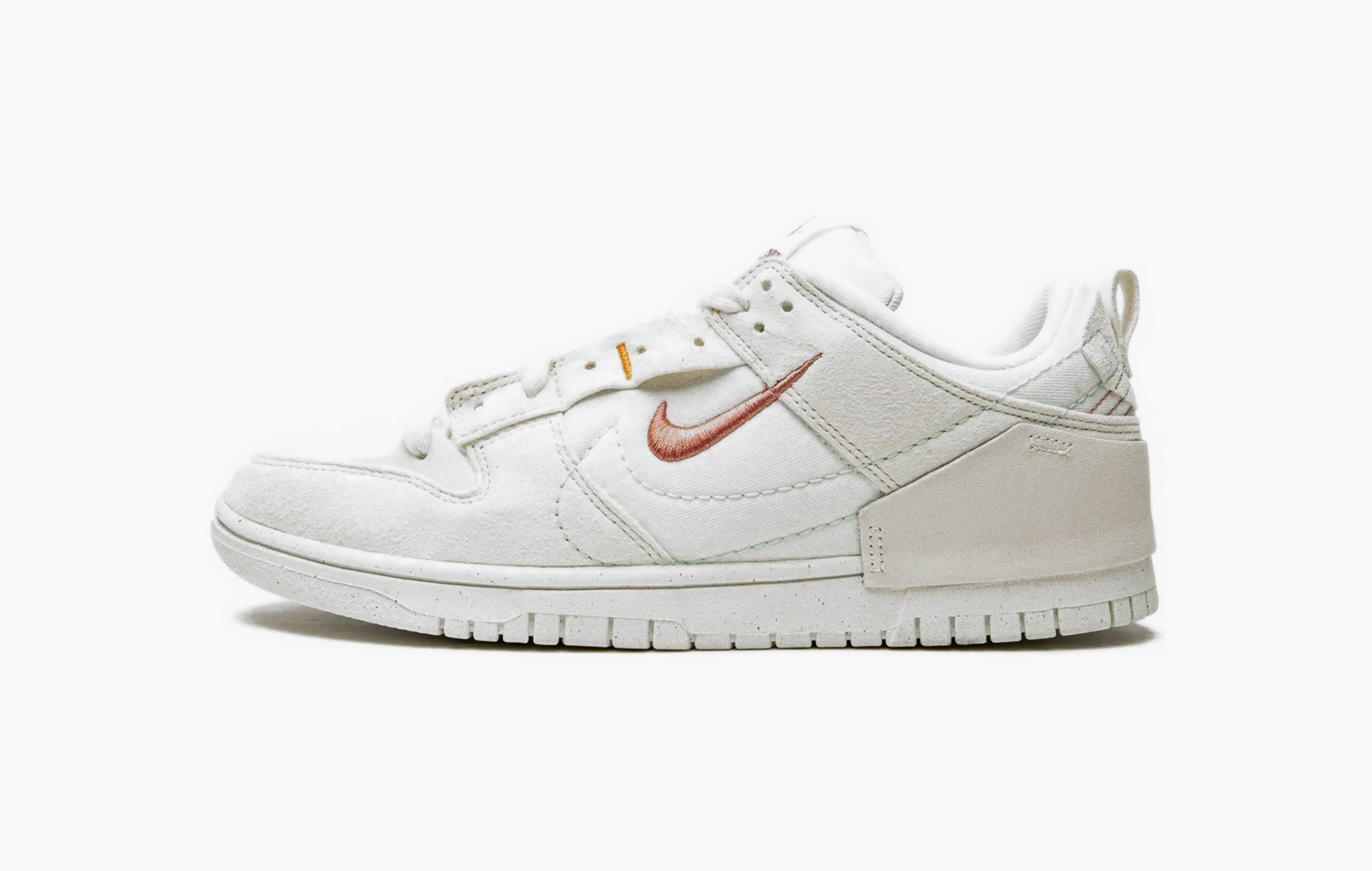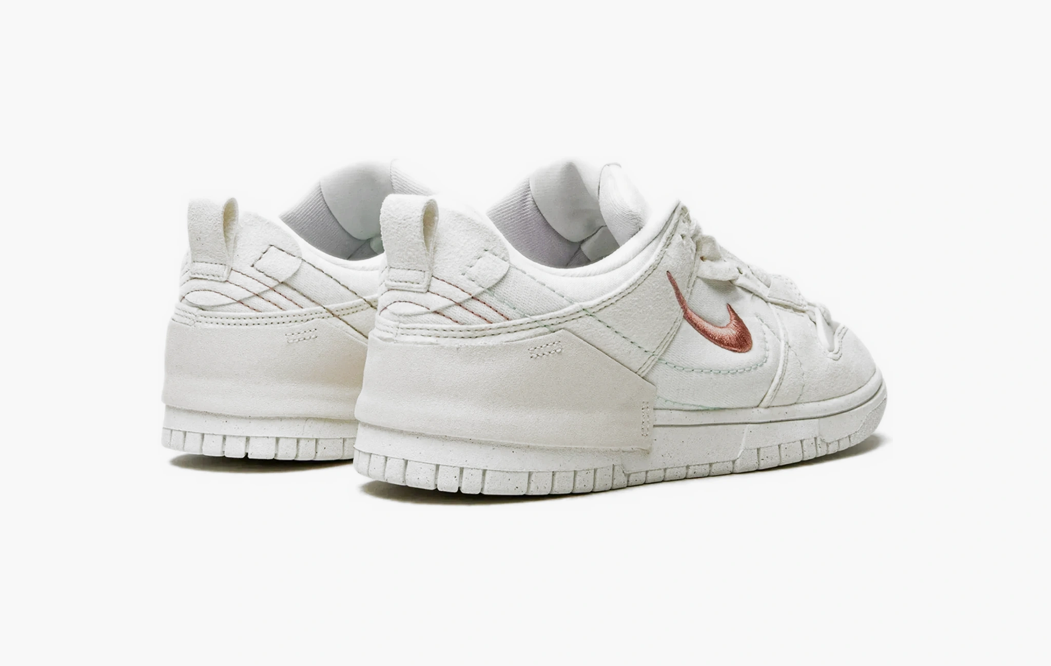Кроссовки Dunk Low Disrupt 2 WMNS "Pale Ivory", представленные эксклюзивно в женской размерной сетке, выглядят невероятно стильно и интересно. Белый текстиль, выбранный в качестве базы для этой пары, дополнен небрежно пришитыми замшевыми деталями цвета слоновой кости. Необычным решением стали двойные свуши: вышитые терракотовые и бирюзовые, выполненные в виде контура. Оранжевые акценты около люверсов, розовая строчка на задниках и логотипы "Nike" на язычках делают дизайн более сложным и интригующим. Подошва данных кроссовок имеет несколько преимуществ: она произведена из переработанного сырья с применением амортизирующих технологий. Компания Nike презентовала Dunk Low Disrupt 2 WMNS "Pale Ivory" в конце марта 2022 года.