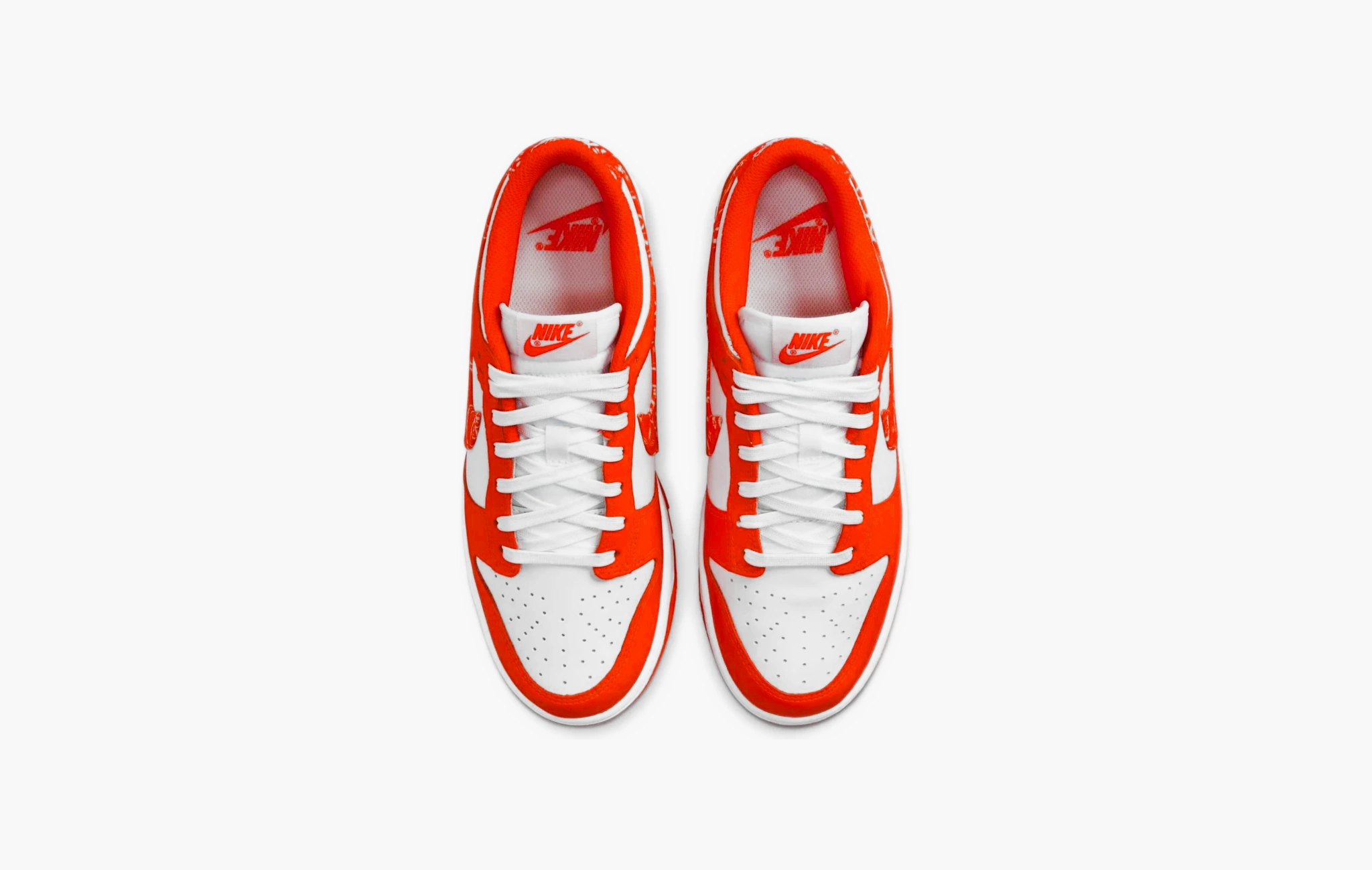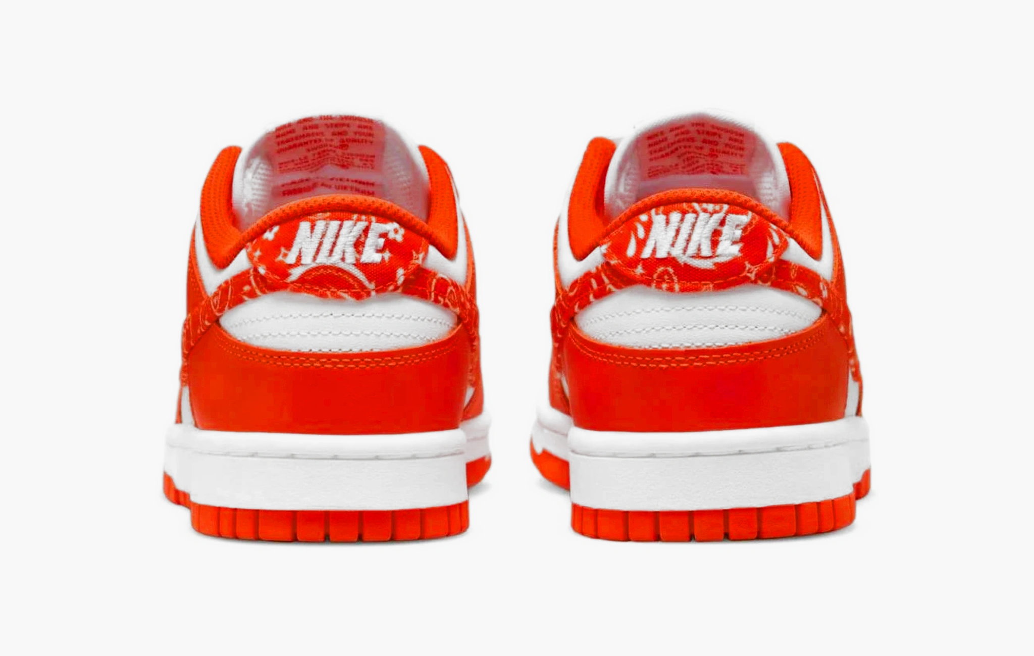 Dunk Low Essential WMNS "Paisley Pack - Orange" — это, пожалуй, самая яркая и запоминающаяся расцветка в новой коллекции "Paisley Pack" от компании Nike! Классическая белая основа сочетается здесь с деталями насыщенного оранжевого цвета, размещенные на передней и задней частях обуви, а также около люверсов. В этот же оттенок открашена подкладка кроссовок, логотипы на язычках и половина износостойкой подошвы. Главной особенностью пар из этой линейки стали узорчатые свуши, находящиеся по бокам. Завершают дизайн параллельно прошитые полосы на пятках и вышивки "Nike", расположенные там же. Кроссовки Dunk Low Essential WMNS "Paisley Pack - Orange" были представлены в мае 2022 года в женской размерной сетке.