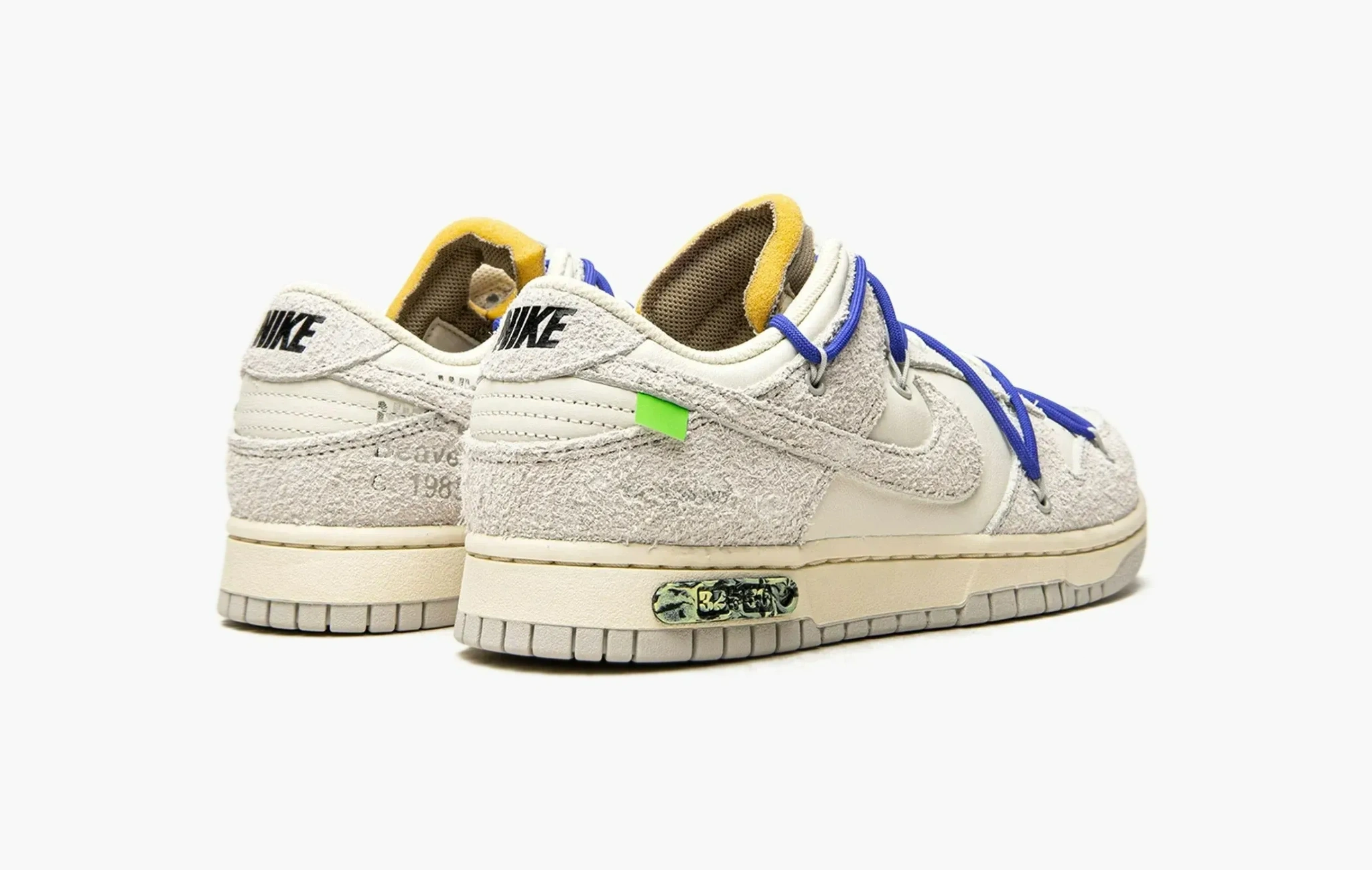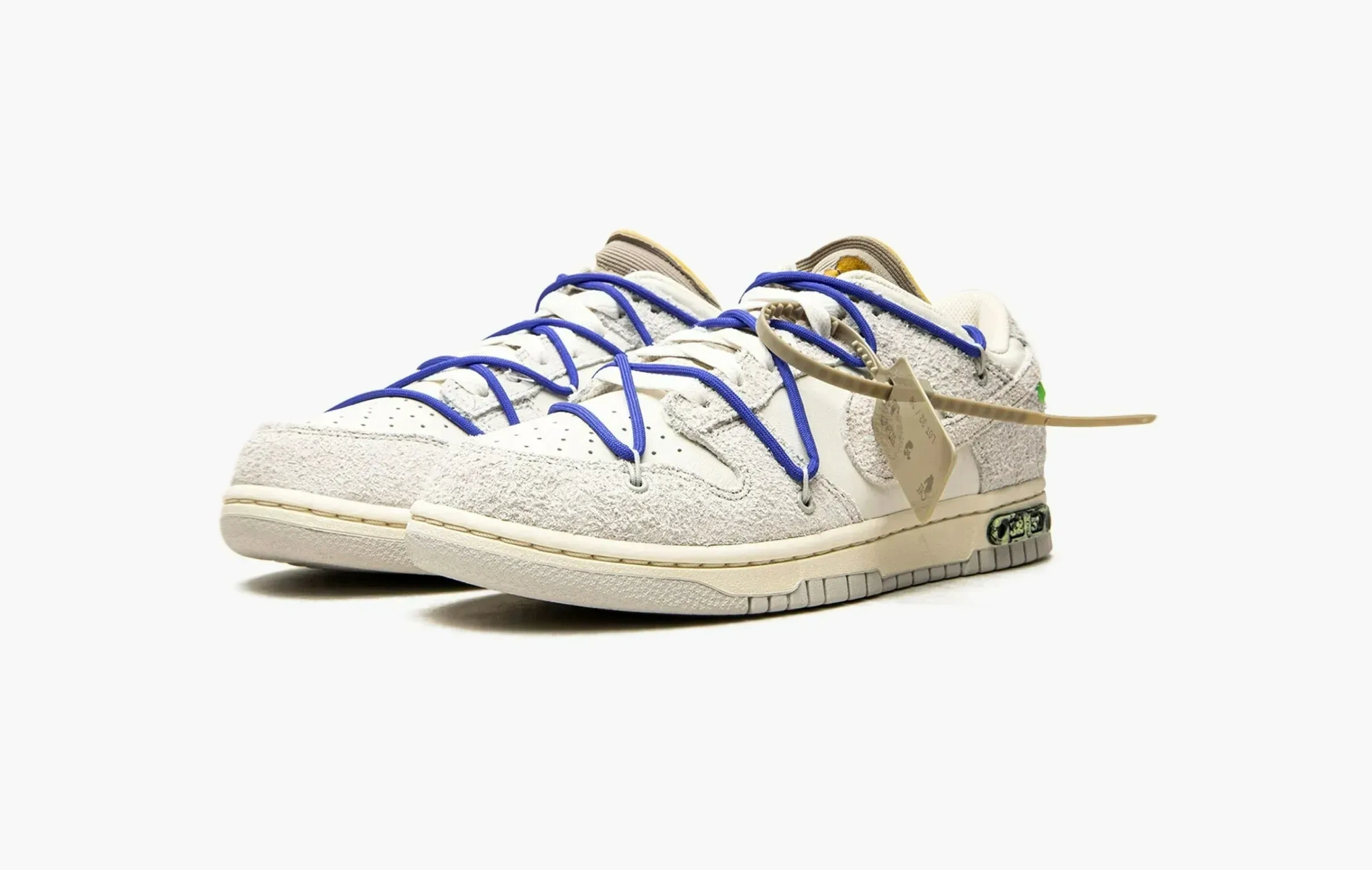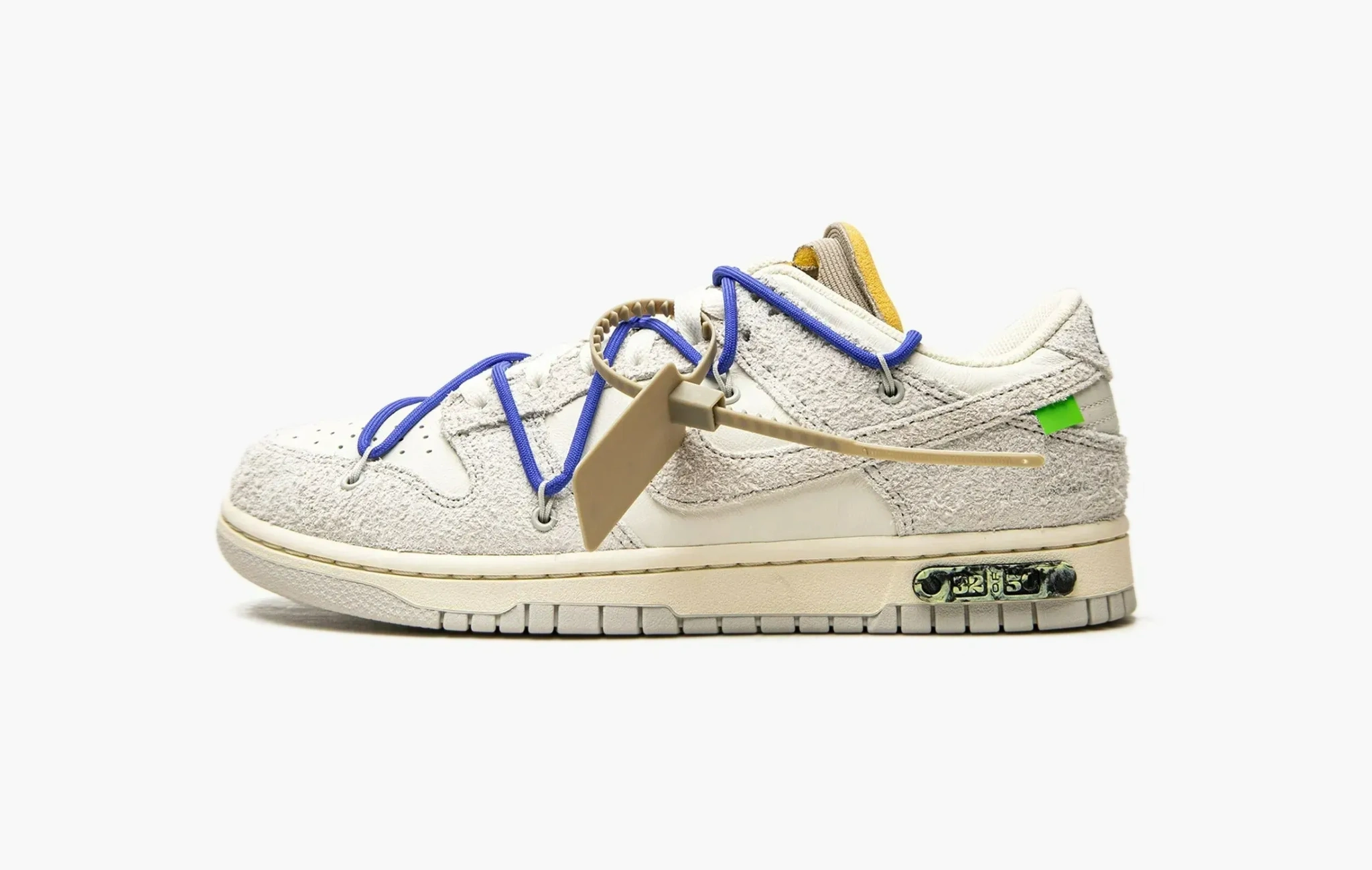 В 2021 году Вирджил Абло удивил мир огромной коллекцией кроссовок “The 50” в рамках коллаборации с Nike. По названию легко догадаться, что было выпущено 50 уникальных расцветок модели Dunk Low. Лоты под номером 1 и 50 кардинально отличались от остальных, оставшиеся экземпляры, в основе своей, были похожи. Лот 32 выполнен из кожи и замши, имеет дополнительную синюю шнуровку, яркий язычок коричневого цвета и другие мелкие фирменные детали.