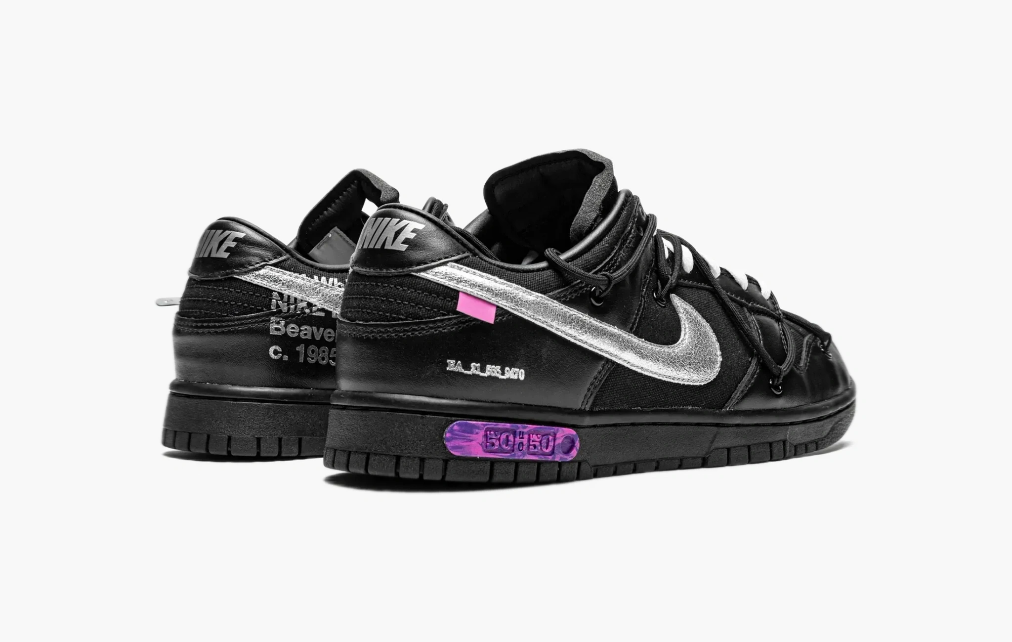 В 2021 году Вирджил Абло удивил мир огромной коллекцией кроссовок “The 50” в рамках коллаборации с Nike. По названию легко догадаться, что было выпущено 50 уникальных расцветок модели Dunk Low. Лоты под номером 1 и 50 кардинально отличались от остальных, оставшиеся экземпляры, в основе своей, были похожи (бело-серая цветовая гамма). 50-ый лот – это практически полностью чёрные кроссовки с серебряным свушем и множеством деталей в стиле Off-White.