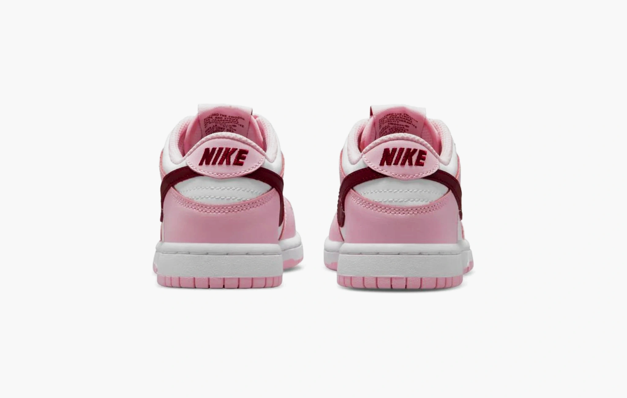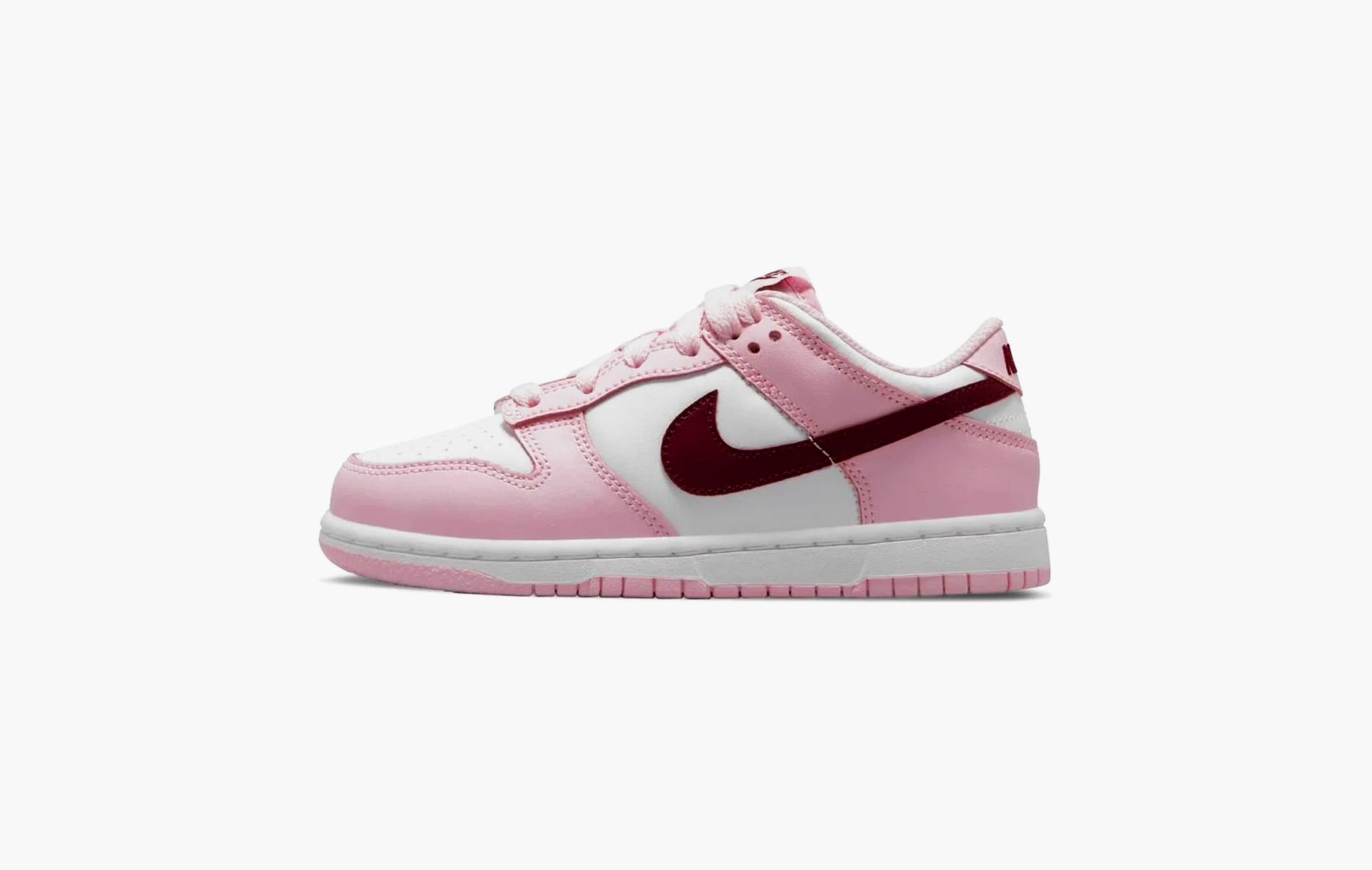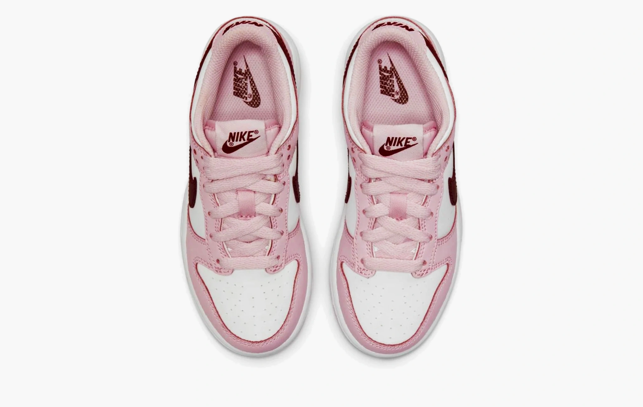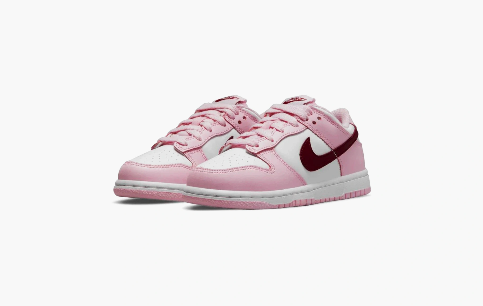 Если вы не знаете, что подарить на День Святого Валентина своей девушке, то у нас есть идея. Эти Nike Dunk Low “Pink/Red/White” сочетают в себе те самые оттенки праздника всех влюблённых. Бело-розовый верх украшен бордовым свушем и брендингом на пятках и язычках. К такой паре можно приложить букет цветов, и идеальный подарок готов.