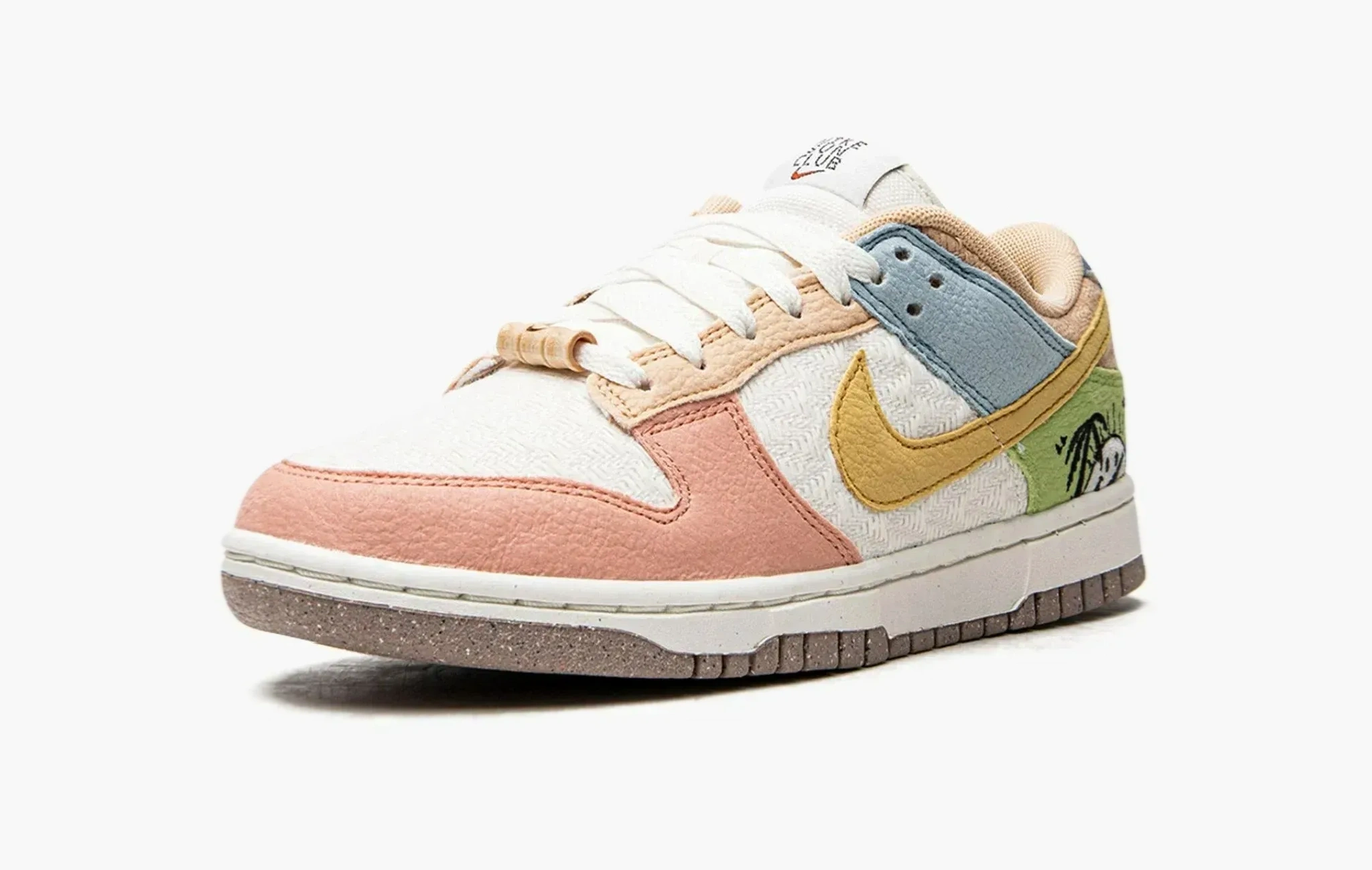 Ловите лучи солнечного настроения круглый год вместе с яркими кроссовками Dunk Low Retro SE WMNS "Sun Club - Multi" от всемирно известной корпорации Nike! Основа пары изготовлена из белого материала с интересным плетением, который был дополнен различными кожаными элементами пастельных оттенков: бежевого, персиково-розового, светло-голубого и салатового. В теплый желтый цвет были окрашены фирменные свуши, а около задников мы замечаем вышивку с летним мотивом. Интересно, что рот у вышитого солнышка также выполнен в виде логотипа компании. Неоднородная окраска подошвы данных кроссовок обусловлена тем, что она произведена из вторичного сырья. Dunk Low Retro SE WMNS в расцветке "Sun Club - Multi" поступили в продажу в 2022 году.