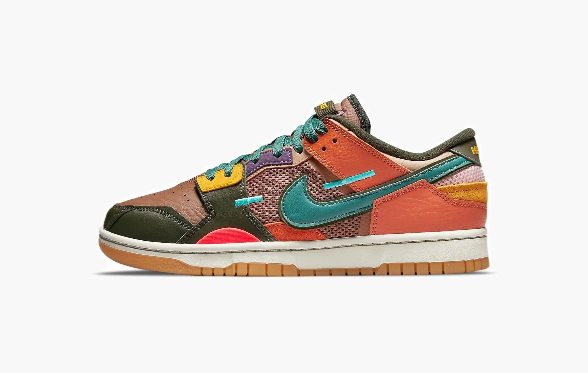 Nike Dunk Low Scrap – это экспериментальная версия знакомых вам “данков” со своими секретами. Естественно, бренды обуви тоже иногда показывают свои экологические инициативы, пытаясь привлечь внимание к проблеме избыточного потребления. Поэтому данный релиз и сделан словно из остатков с производства (странная сборка, асимметричные детали). Верх выполнен из кожи, сетки и замши ярких оттенков.