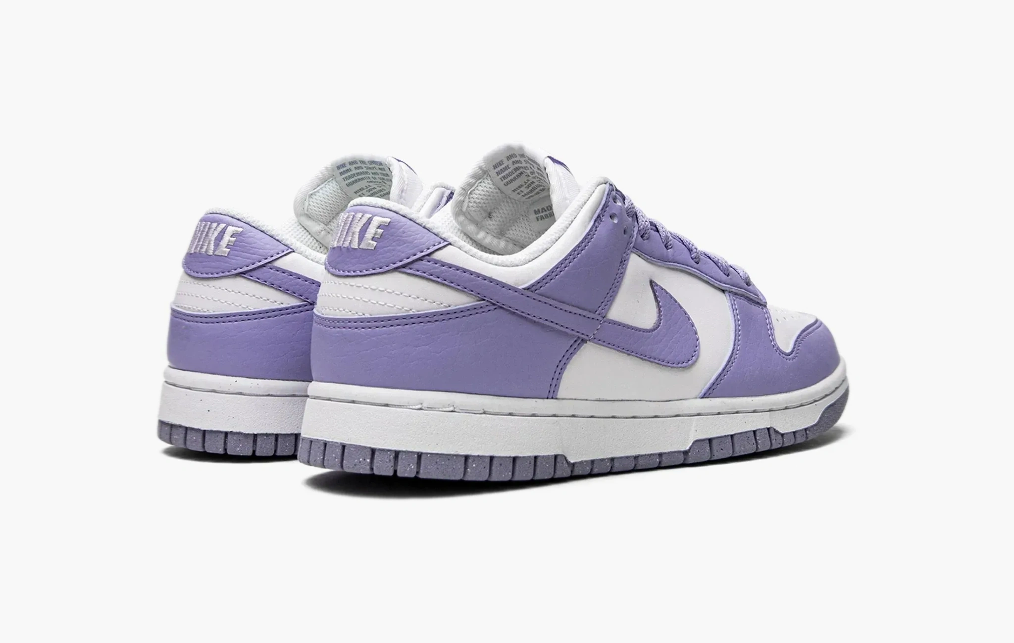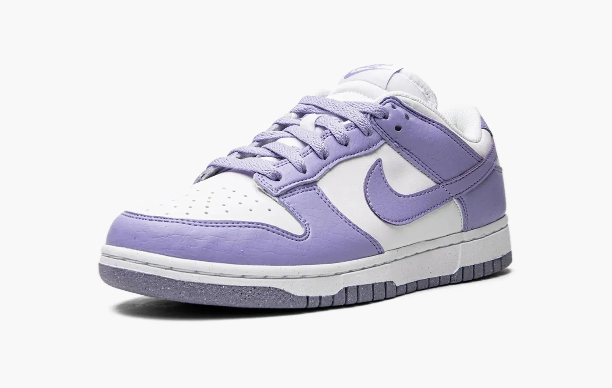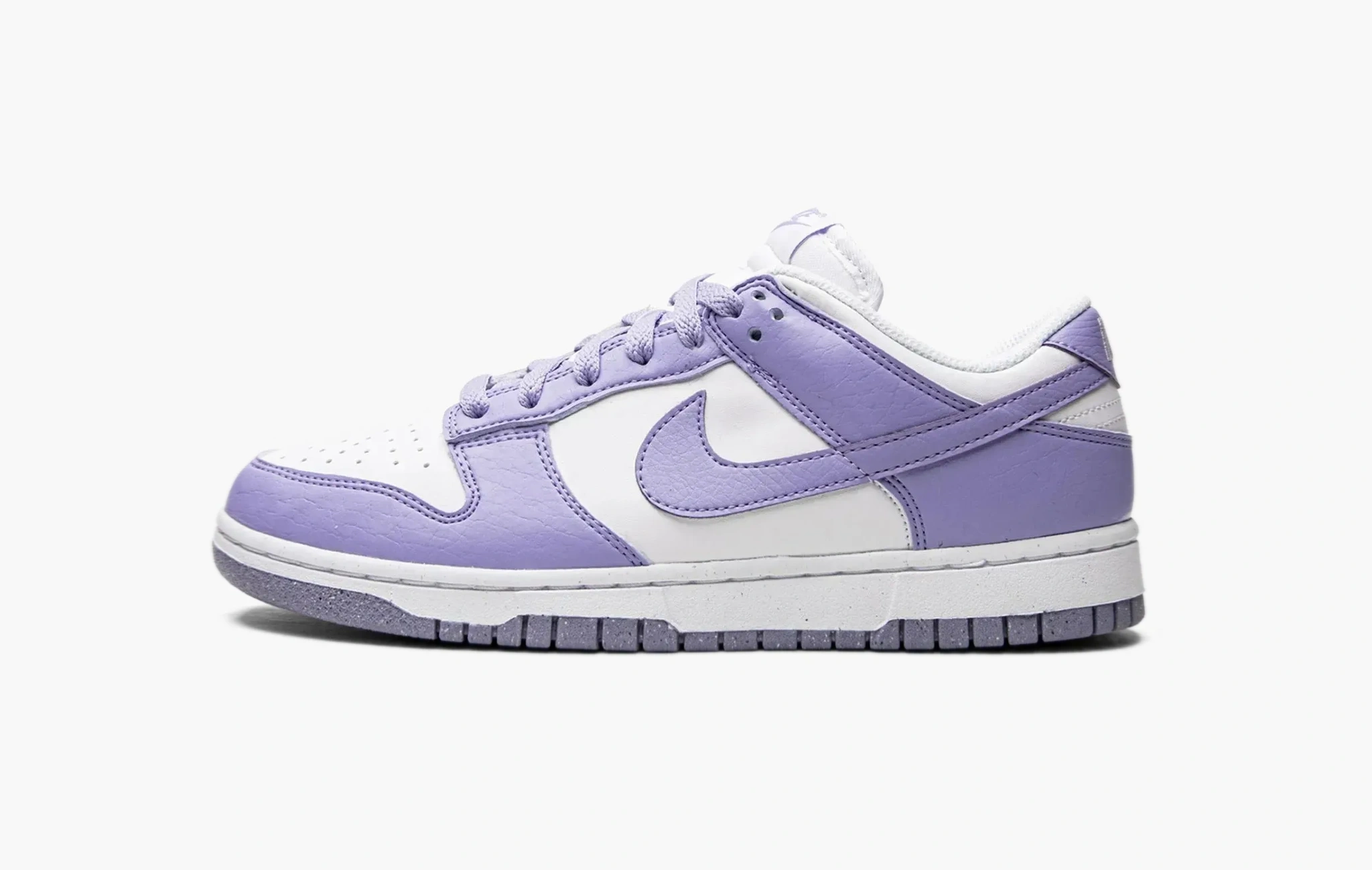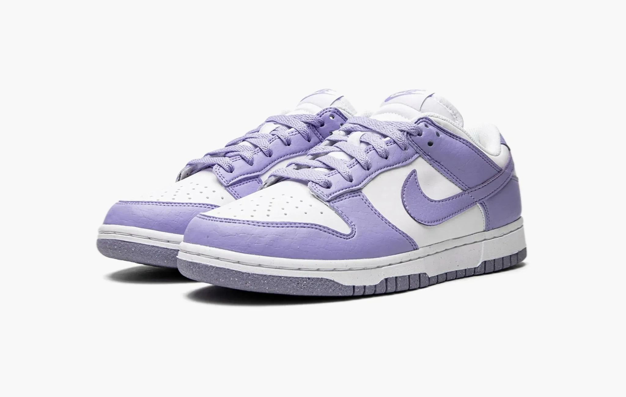 Кроссовки Dunk Low WMNS "Next Nature - Lilac" были выпущены в рамках экологической инициативы, компании Nike, поэтому мы можем наблюдать небольшие вкрапления в подошве этой модели, так как она была произведена из переработанного сырья. В качестве основы для данной пары была выбрана белая кожа, которая уже успела отлично зарекомендовать себя. На боковых поверхностях обуви расположились текстурные кожаные свуши фиалкового оттенка, из этого же материала изготовлены другие классические детали, ставшие неотъемлемыми элементами дизайна всех кроссовок из этой культовой линейки. Dunk Low WMNS "Next Nature - Lilac", представленные эксклюзивно в женской размерной сетке, стали доступны к покупке в середине лета 2022 года.