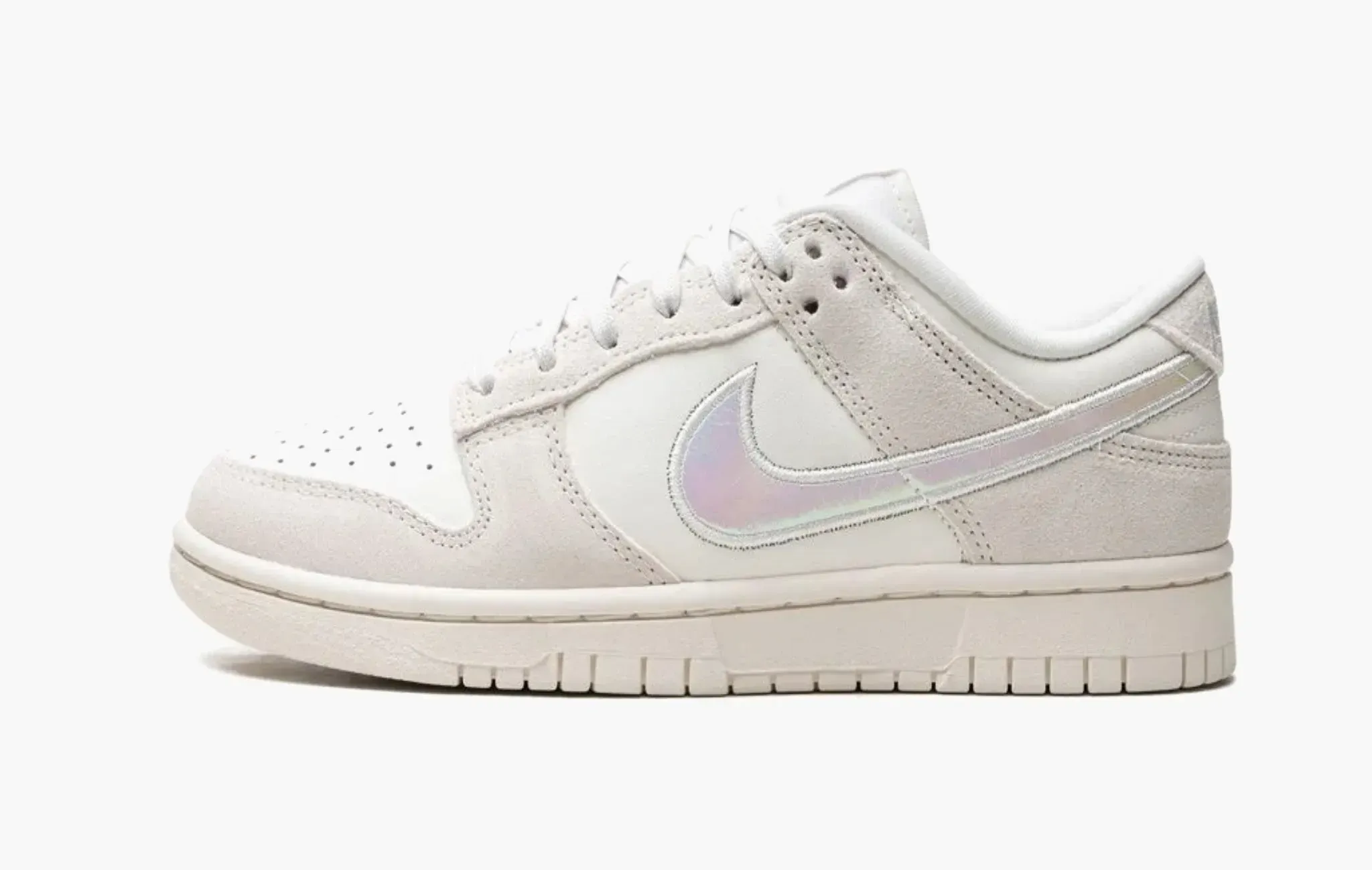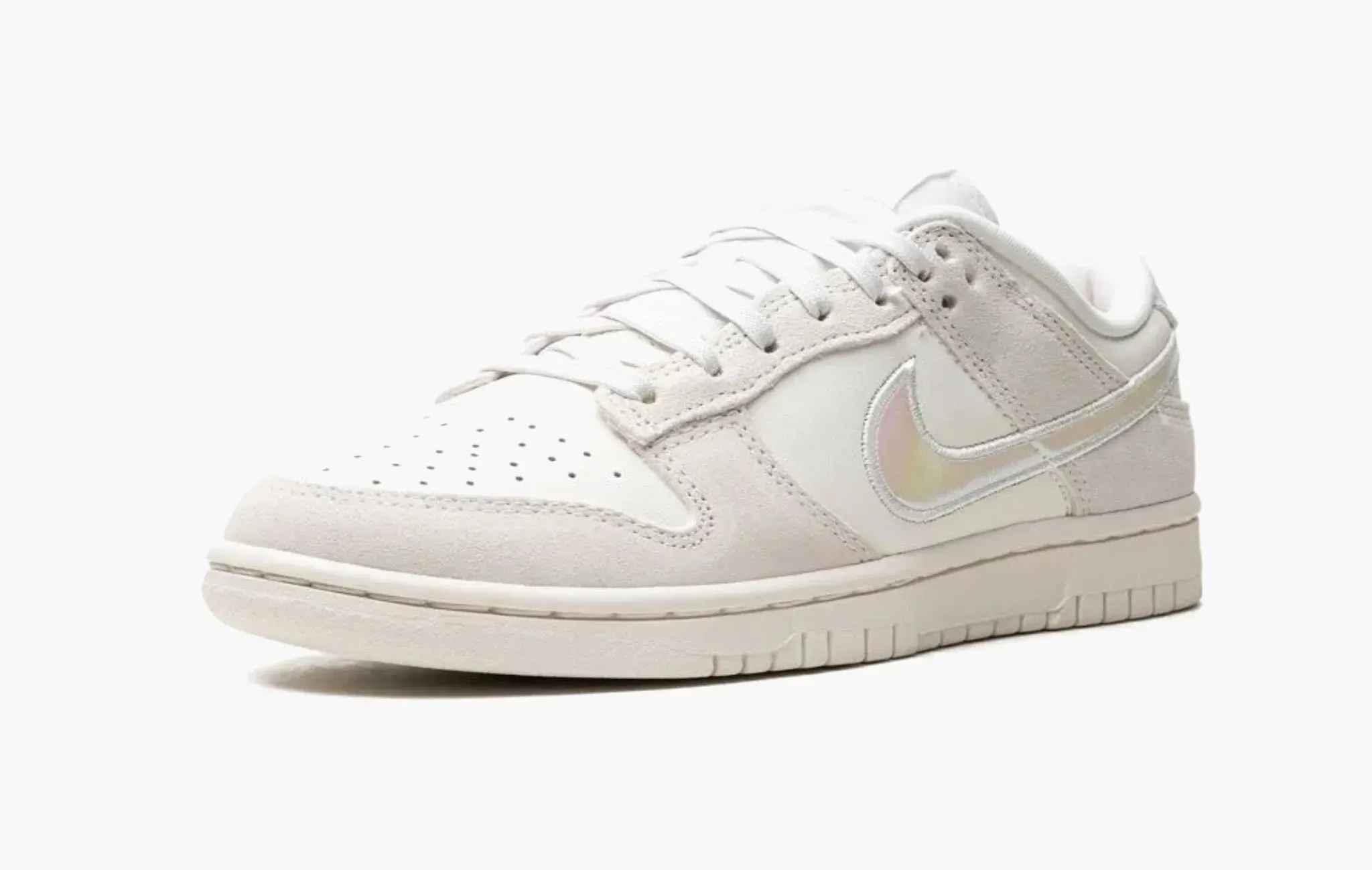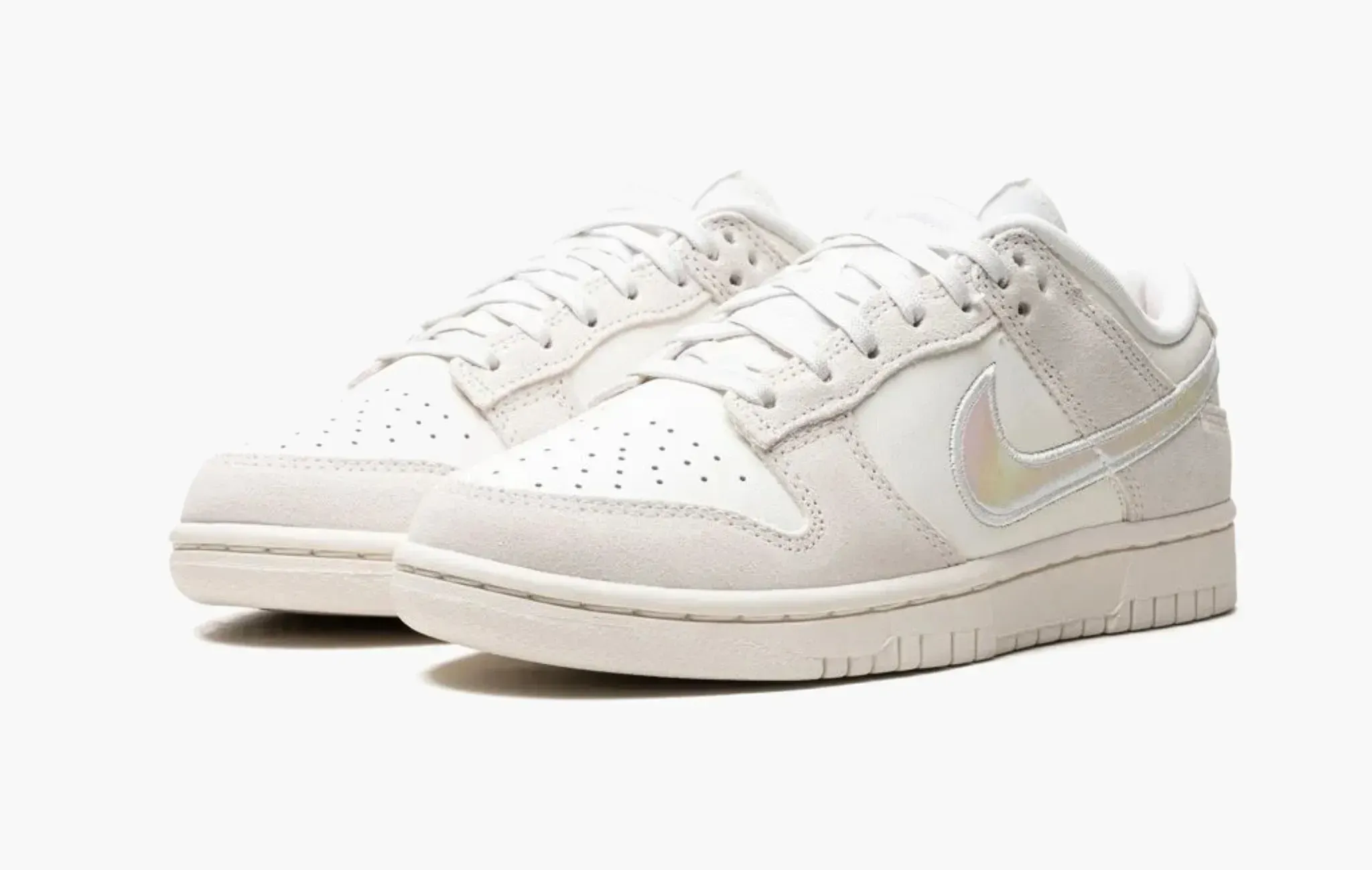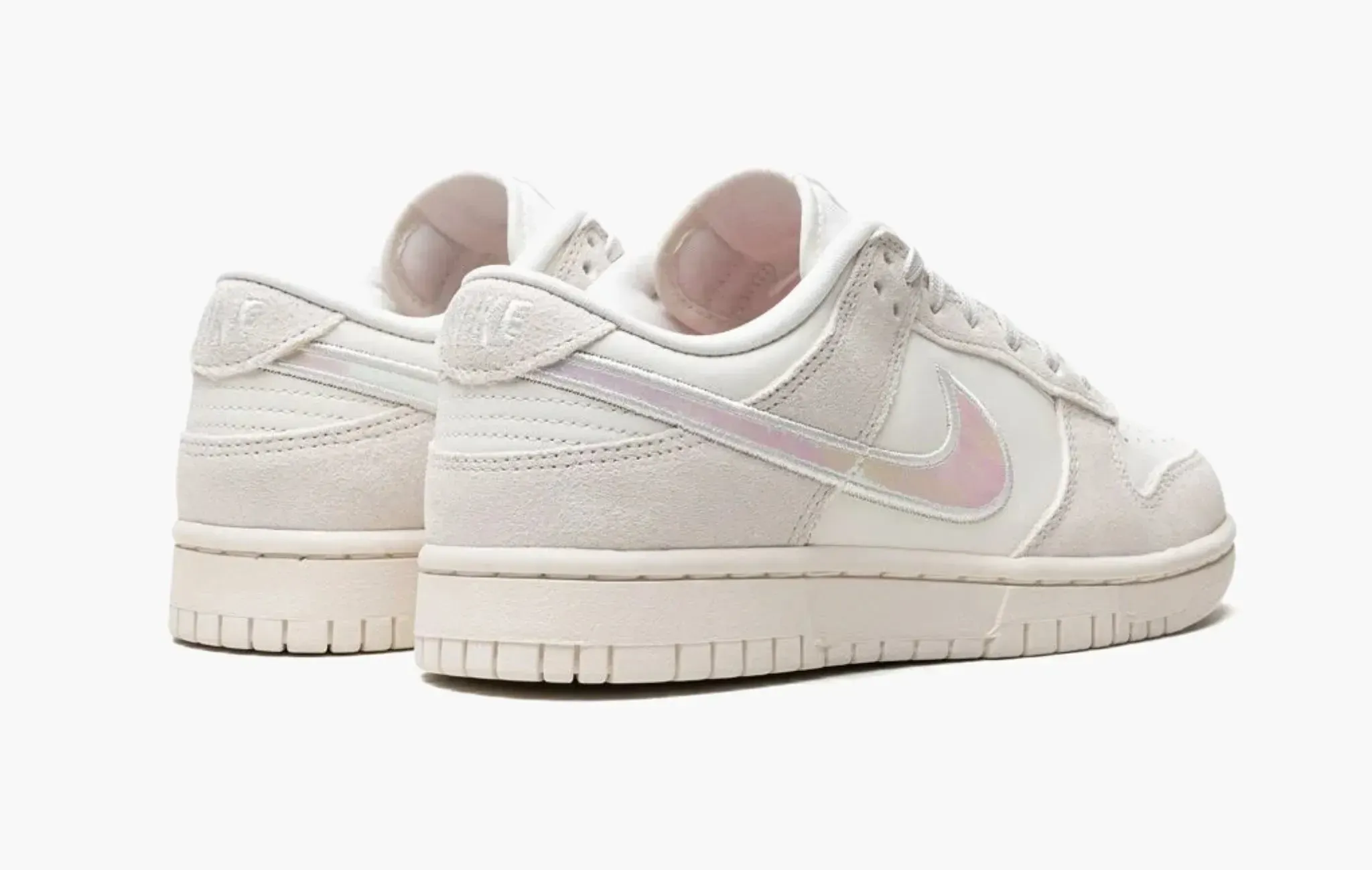 Эксклюзивная женская расцветка Nike Dunk Low “Iridescent Swoosh” сочетает в себе основу из кожи цвета слоновой кости с серыми замшевыми деталями по всей площади верха. Необычной деталью данного релиза является переливающийся розовый “swoosh”, прошитый белой нитью по контуру. Настолько спокойная и нейтральная цветовая гамма напоминает коллаборацию Off-White x Nike Dunk Low “The 50”.
