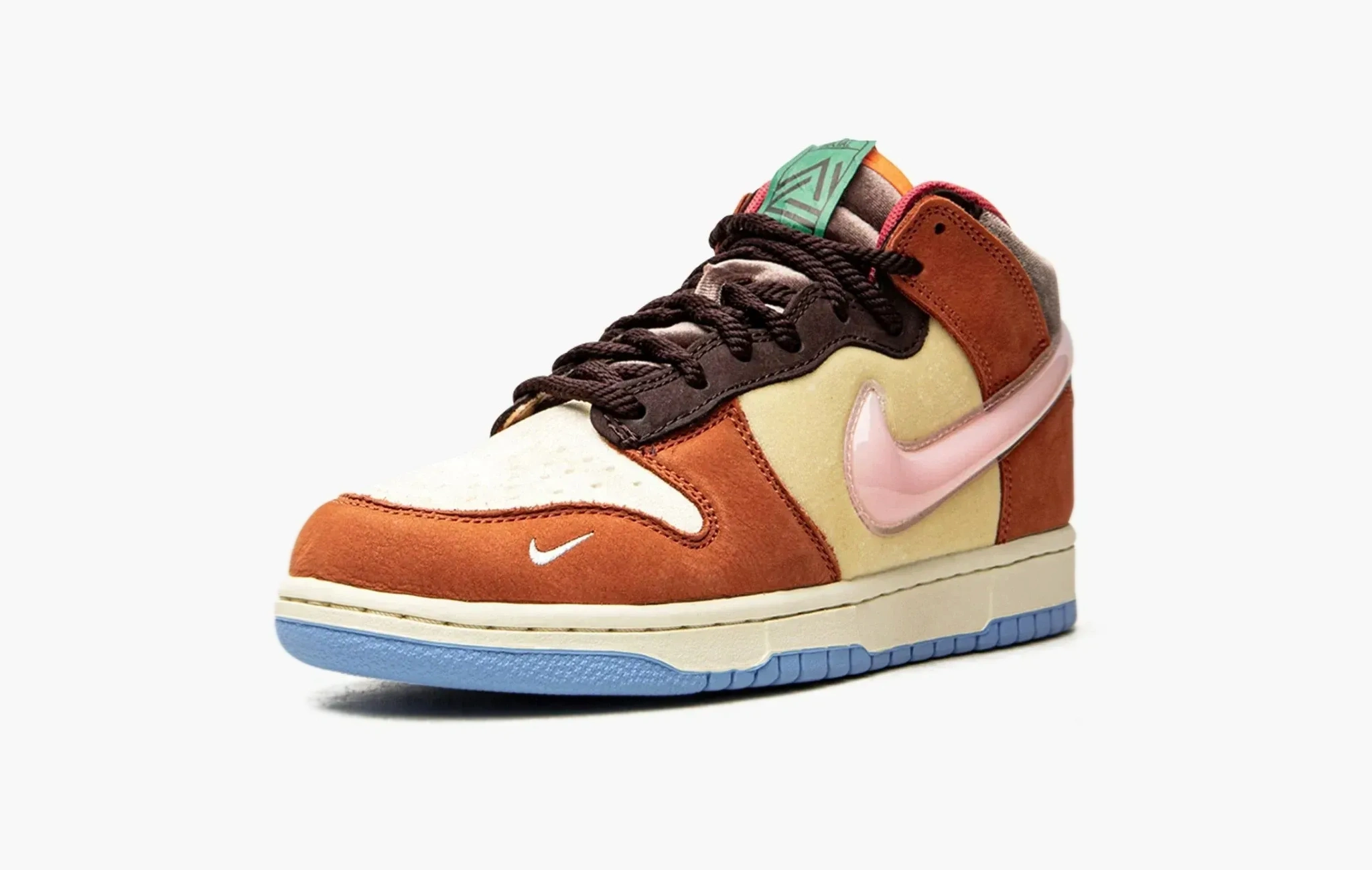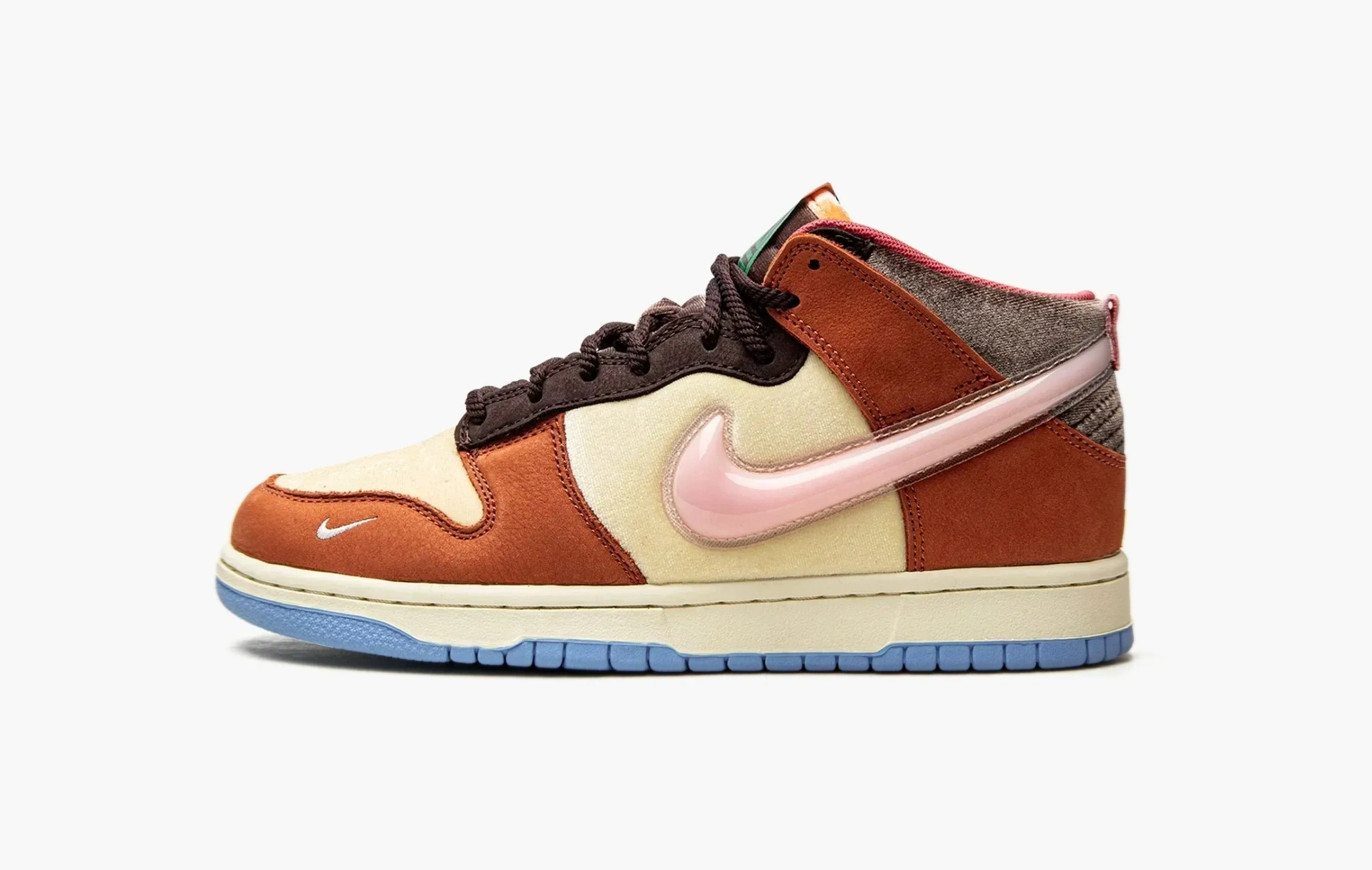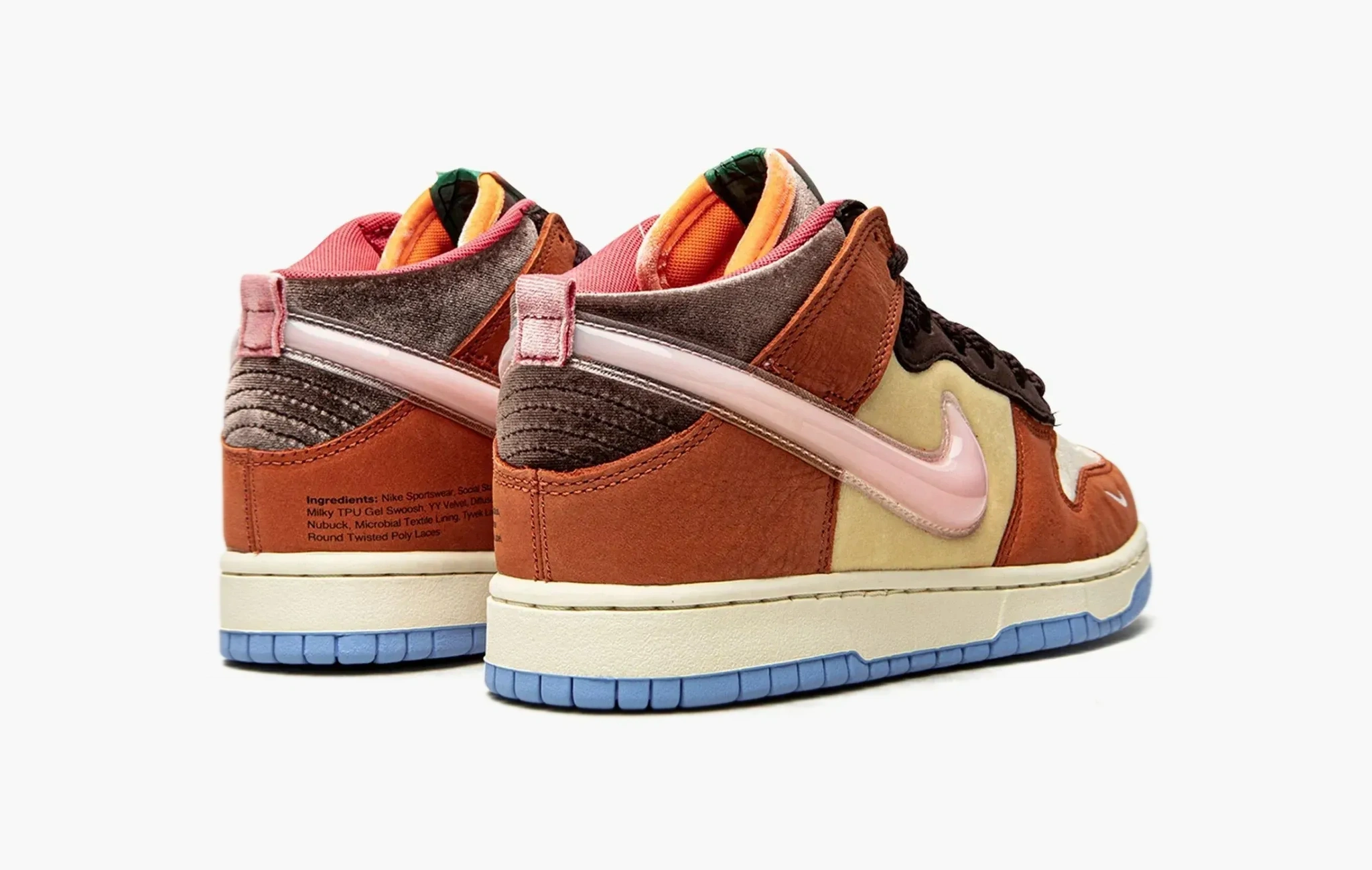 Милые кроссовки Dunk Mid "Social Status Chocolate Milk" стали результатом коллаборации всемирно известного бренда Nike и модного бутика Social Status. Данная пара, произведенная с использованием бежевого и коричневого велюра, а также деталей из рыжеватой замши напоминает своим видом сладкий молочный коктейль из детства! Дополняют дизайн объемные свуши клубничного цвета, зеленые бирки с логотипами брендов, интересные круглые шнурки, а также внушительный "состав" кроссовок, написанный с внутренней стороны обуви. Dunk Mid "Social Status Chocolate Milk" появились на прилавках магазинов в середине сентября 2021 года. В рамках этого сотрудничества был также выпущен короткометражный фильм "Free Lunch".