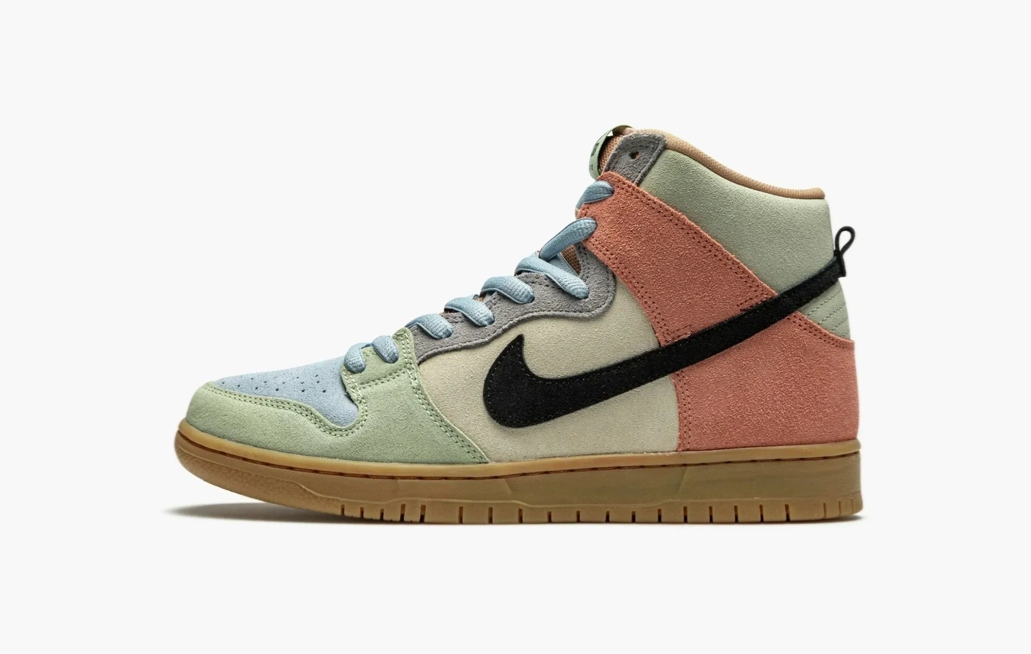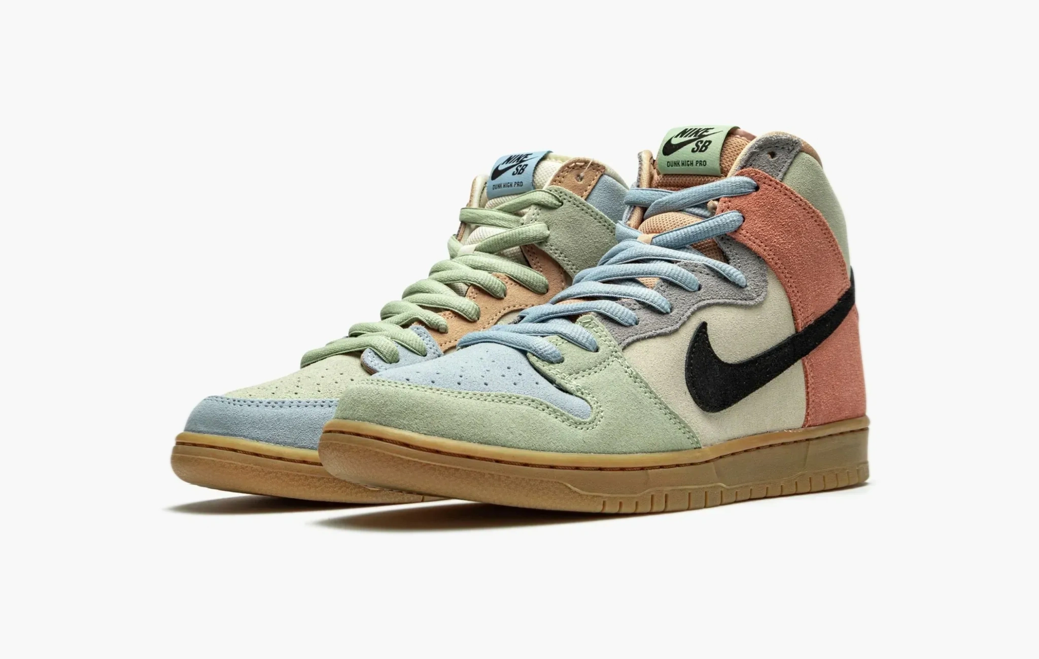 Вышедшие в марте 2020 года Nike SB Dunk High «Spectrum» прекрасны своей весенней палитрой. Верх целиком и полностью выполнен из замши и размещён на подошве в цвет натурального каучука. Асимметричный колорблокинг делает левый и правый кроссовок разными, хотя они оба окрашены в одинаковые оттенки голубого, зеленого и кораллового. Даже шнурки и внутренняя набивка разные с обеих сторон. Неофициально, но данный релиз считается частью линейки пасхальных пар.