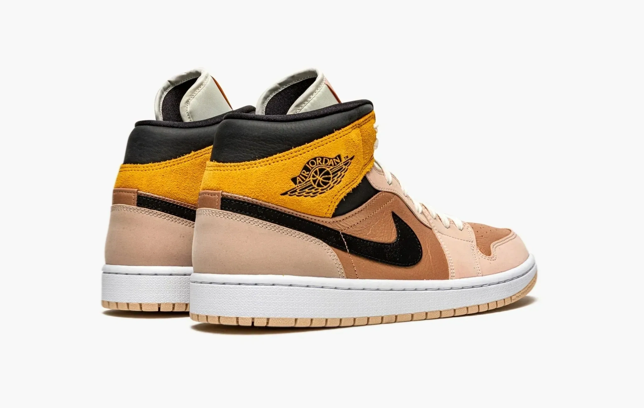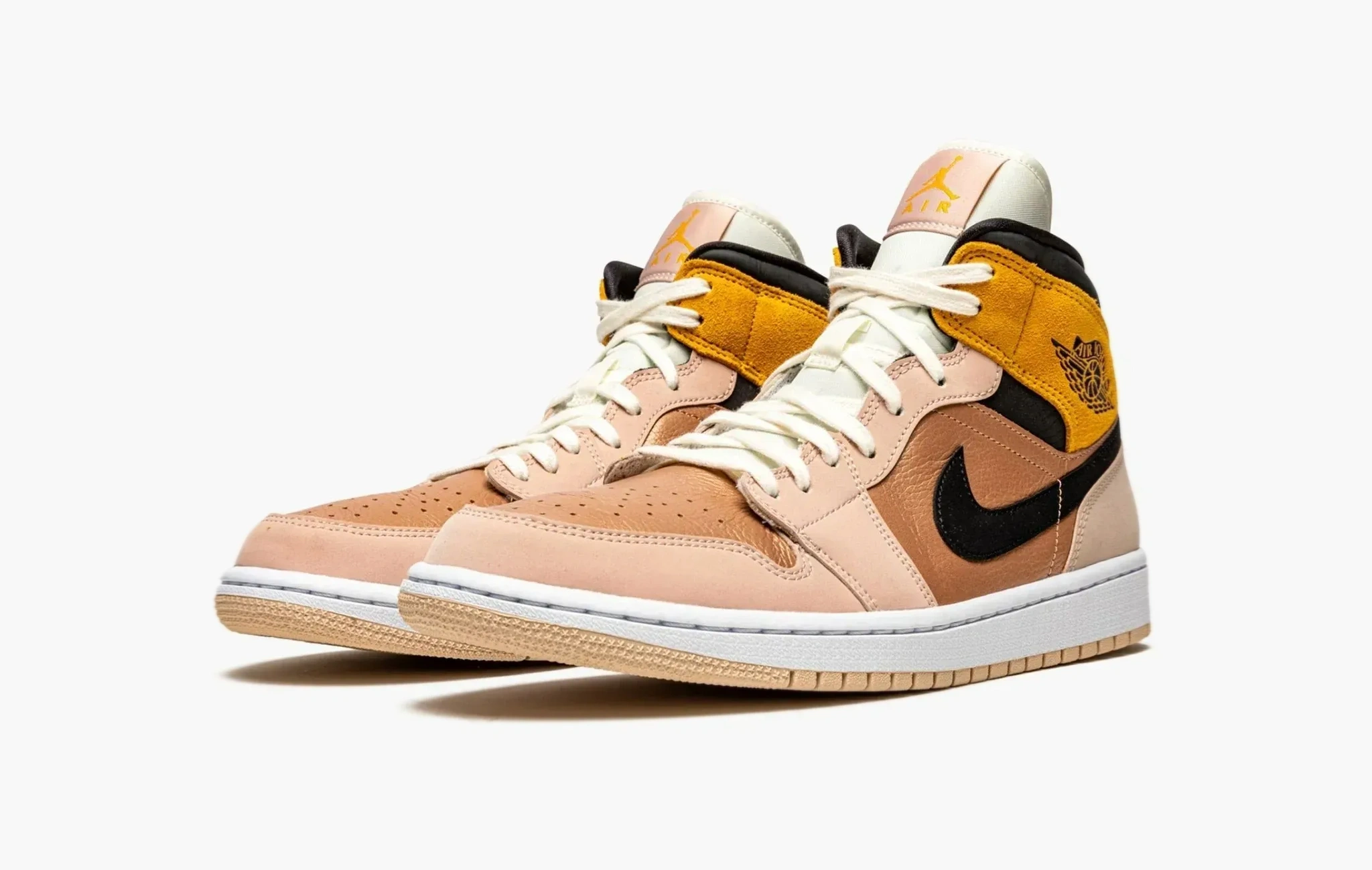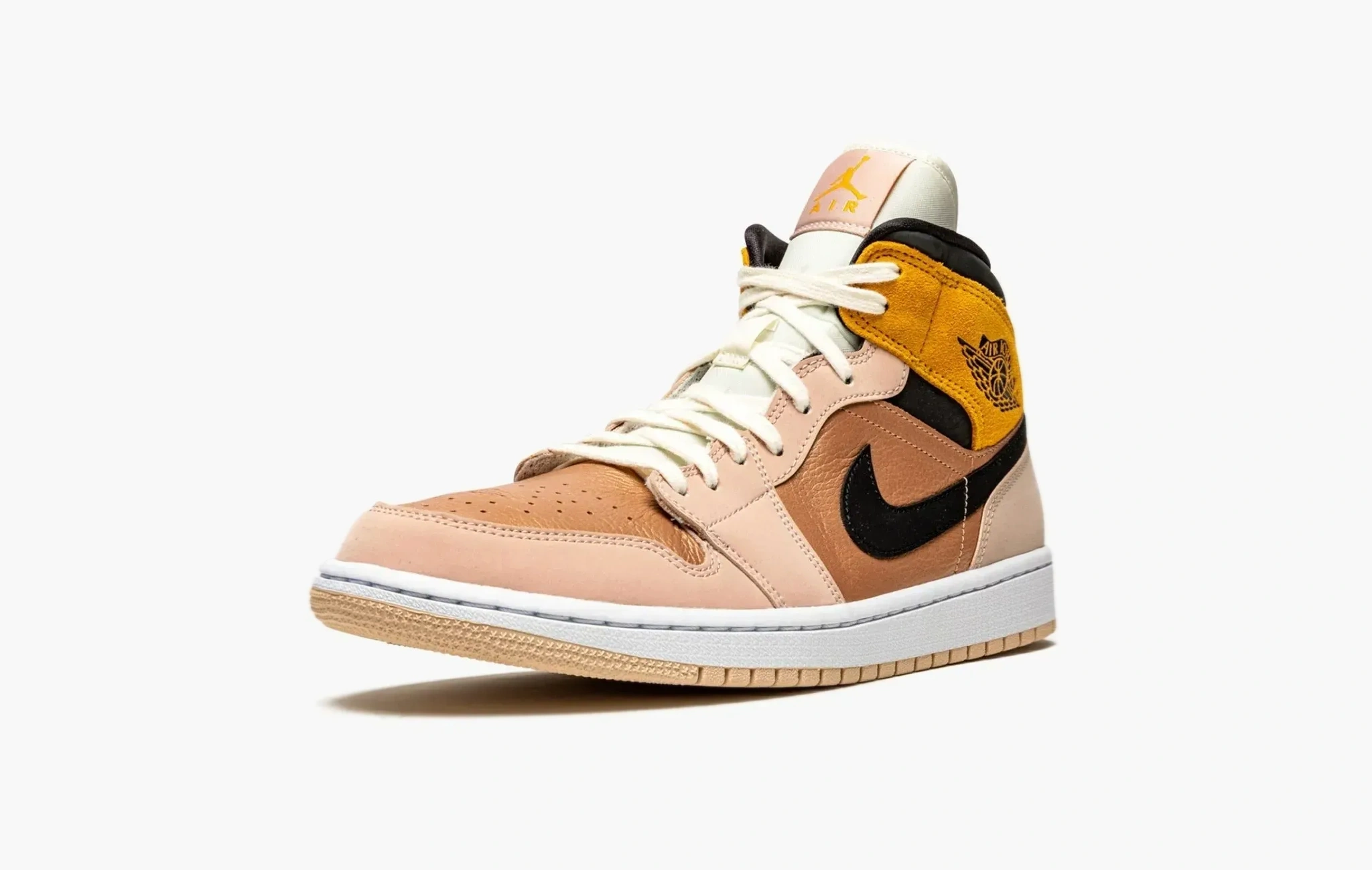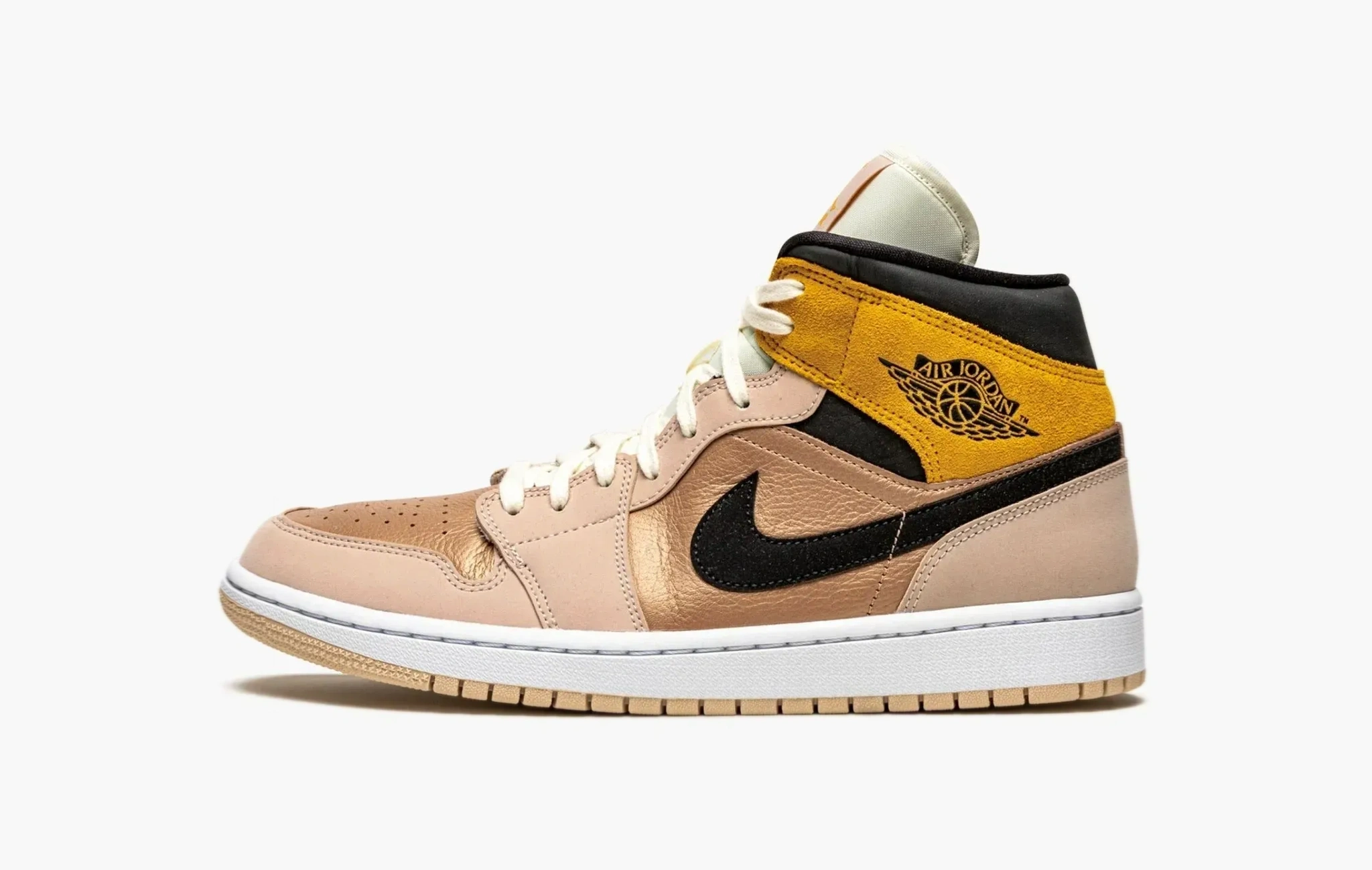 Эксклюзивная женская расцветка Air Jordan 1 Mid SE «Particle Beige» отлично показывает способности дизайнеров Jordan Brand. Лакированная золотистая кожа, пастельно-розовый нубук и тёмно-жёлтая замша – всё это связано язычком и шнурками кремового цвета. Чёрный «свуш» и область голеностопа отлично дополняют такую мягкую цветовую гамму. Эксперимент разметили на белой подошве с бежевым протектором.