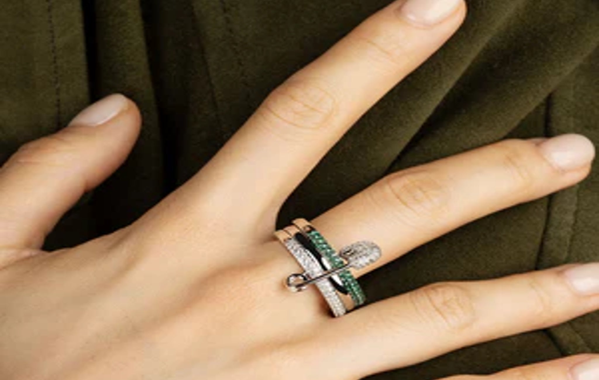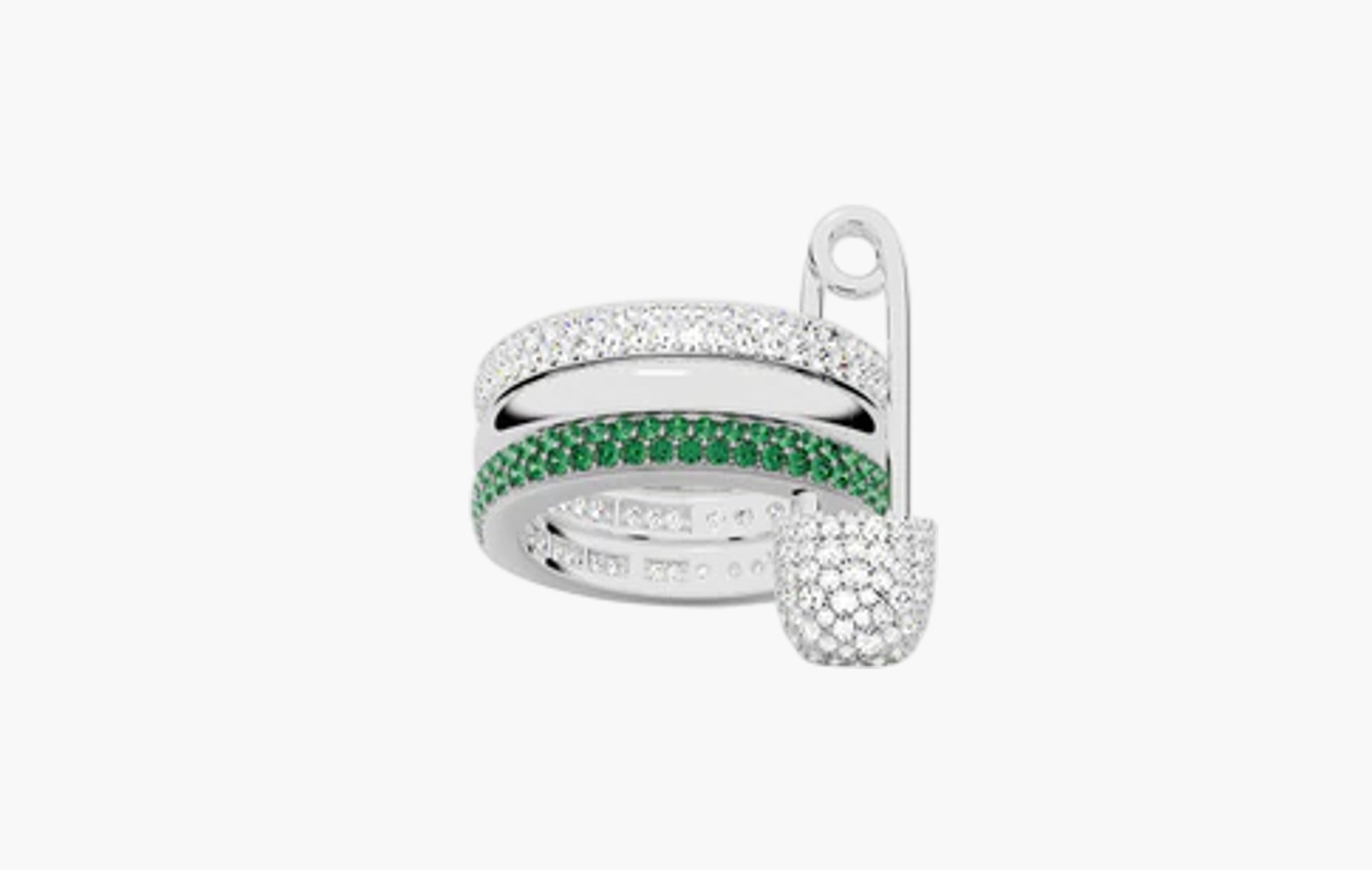 Morse Code Love, Smile, Bonheur Triple Hoop Safety Pin Ring Sterling Silver "White and Green"