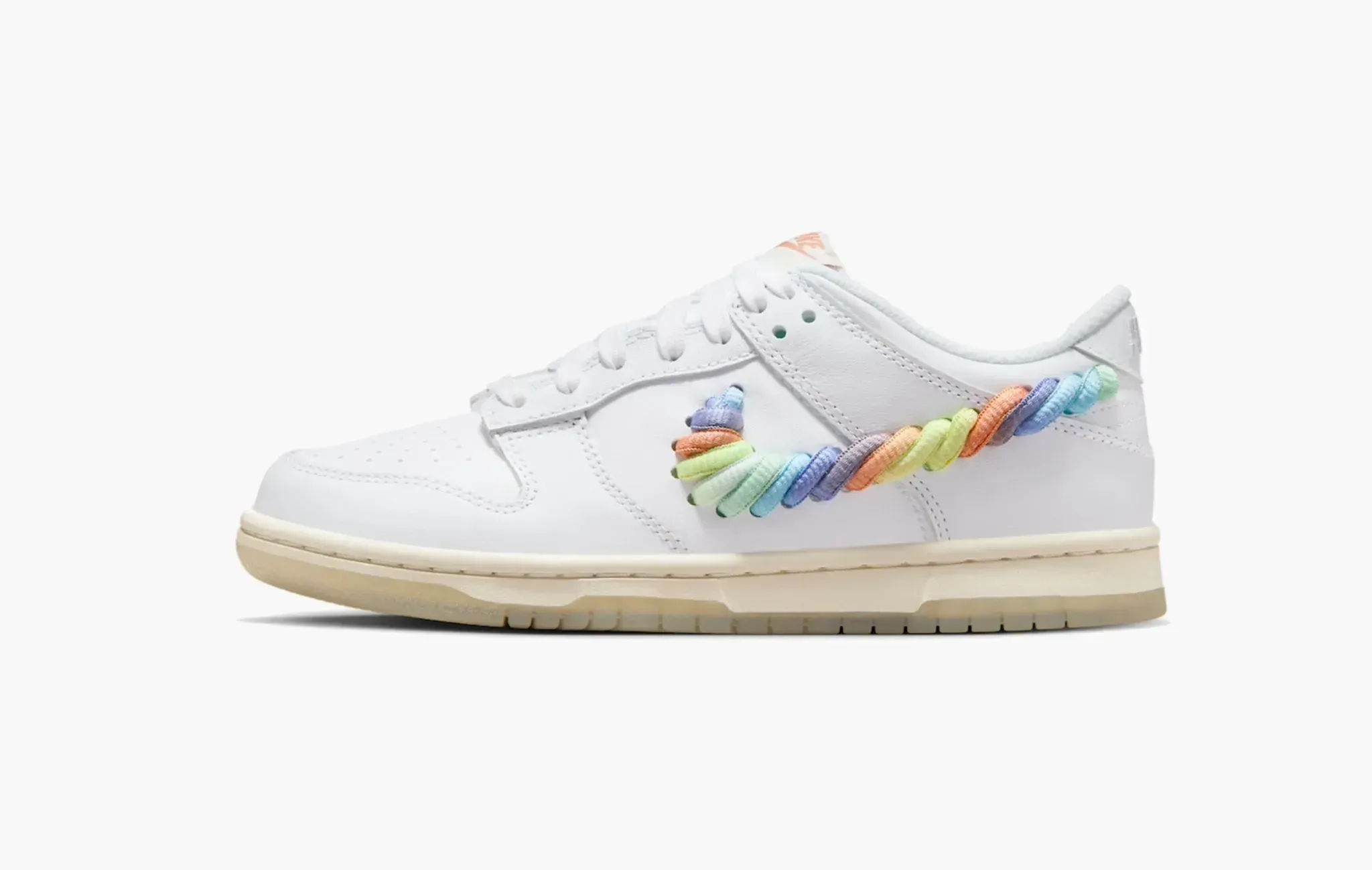 Подростковая (детская) версия кроссовок Nike Duunk Low «Rainbow Lace Swoosh». Не только кастомайзеры играются с формой и материалами свуша, данный приём могут использовать и дизайнеры бренда. В этот раз обыграть культовый логотип решили с помощью радужных шнурков (только на внешней стороне). В остальном – это классические белые кожаные кроссовки на кремовой подошве с полупрозрачным аутсолом.