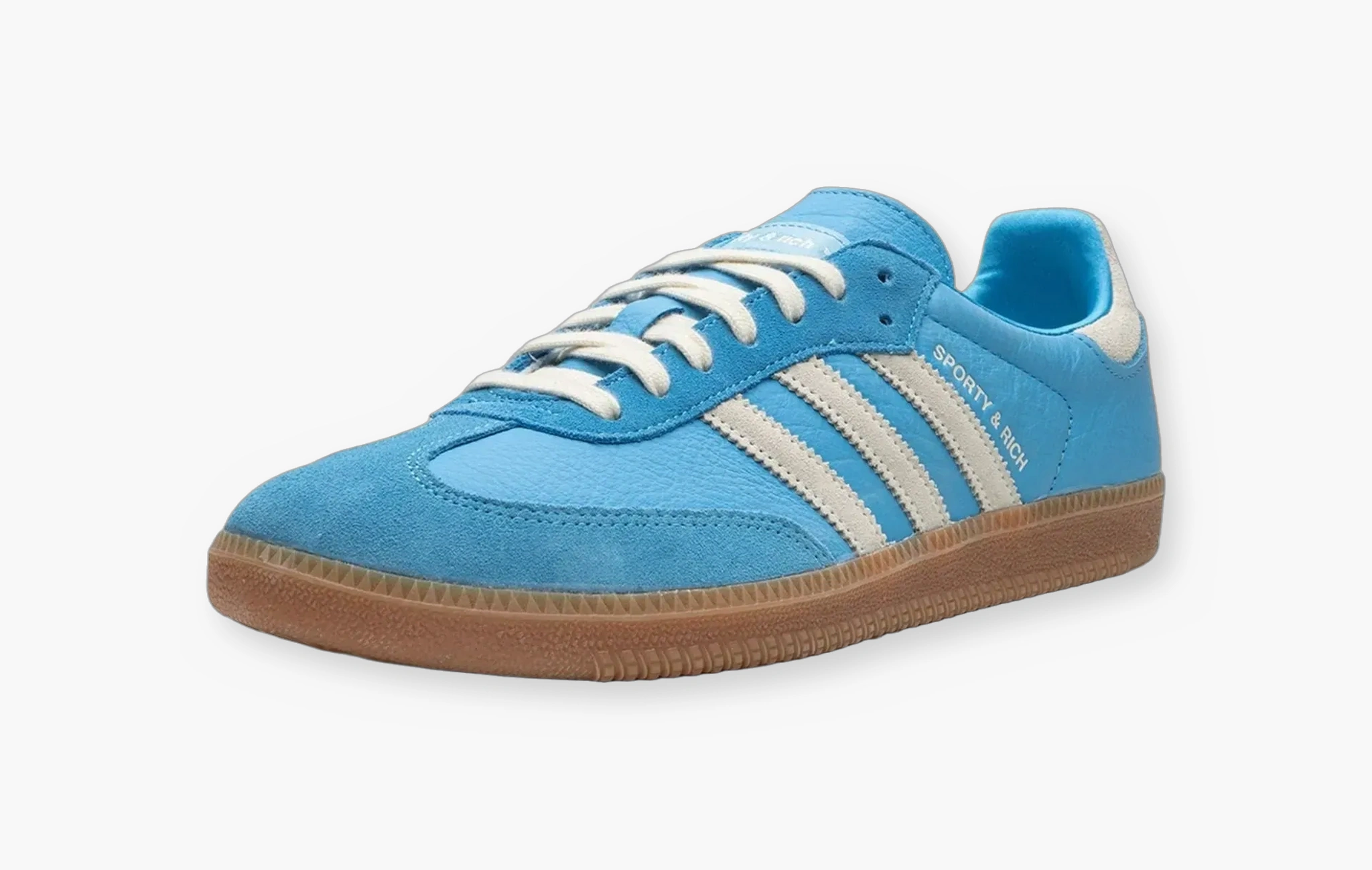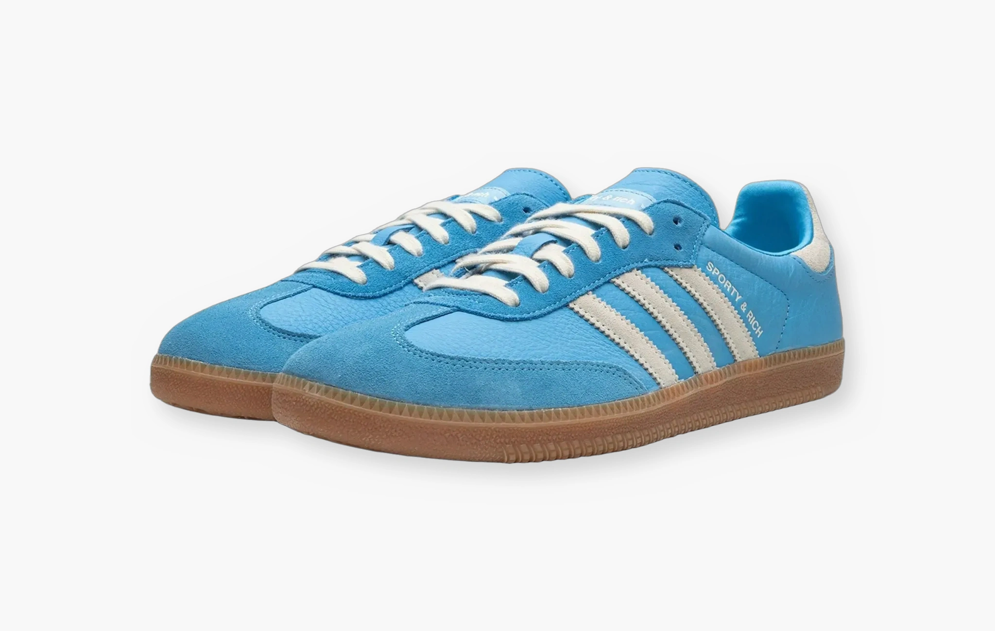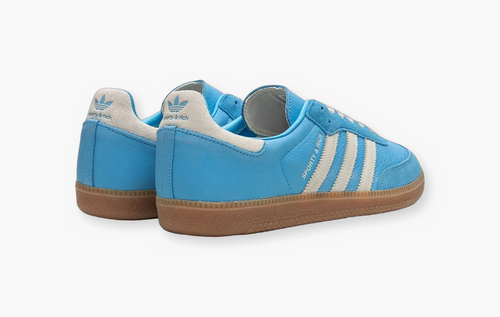 Кроссовки Samba OG "Sporty & Rich Blue Rush" — это яркая новинка с характером! В основу модели была положена высококачественная небесно-голубая кожа, дополненная замшевыми т-образными деталями на носках, а также вставками около люверсов в тон. Из светло-серой замши изготовлены фирменные полосы Adidas на боковых поверхностях кроссовок, а также элементы на пятках. Классическая светло-коричневая подошва из долговечной резины, брендированные атласные нашивки на язычках и жемчужный брелок с золотым медальоном, ставший визитной карточкой данной коллаборации, завершают этот роскошный дизайн в стиле ретро. Adidas и Эмили Оберг представили Samba OG "Sporty & Rich Blue Rush" в начале лета 2023 года.