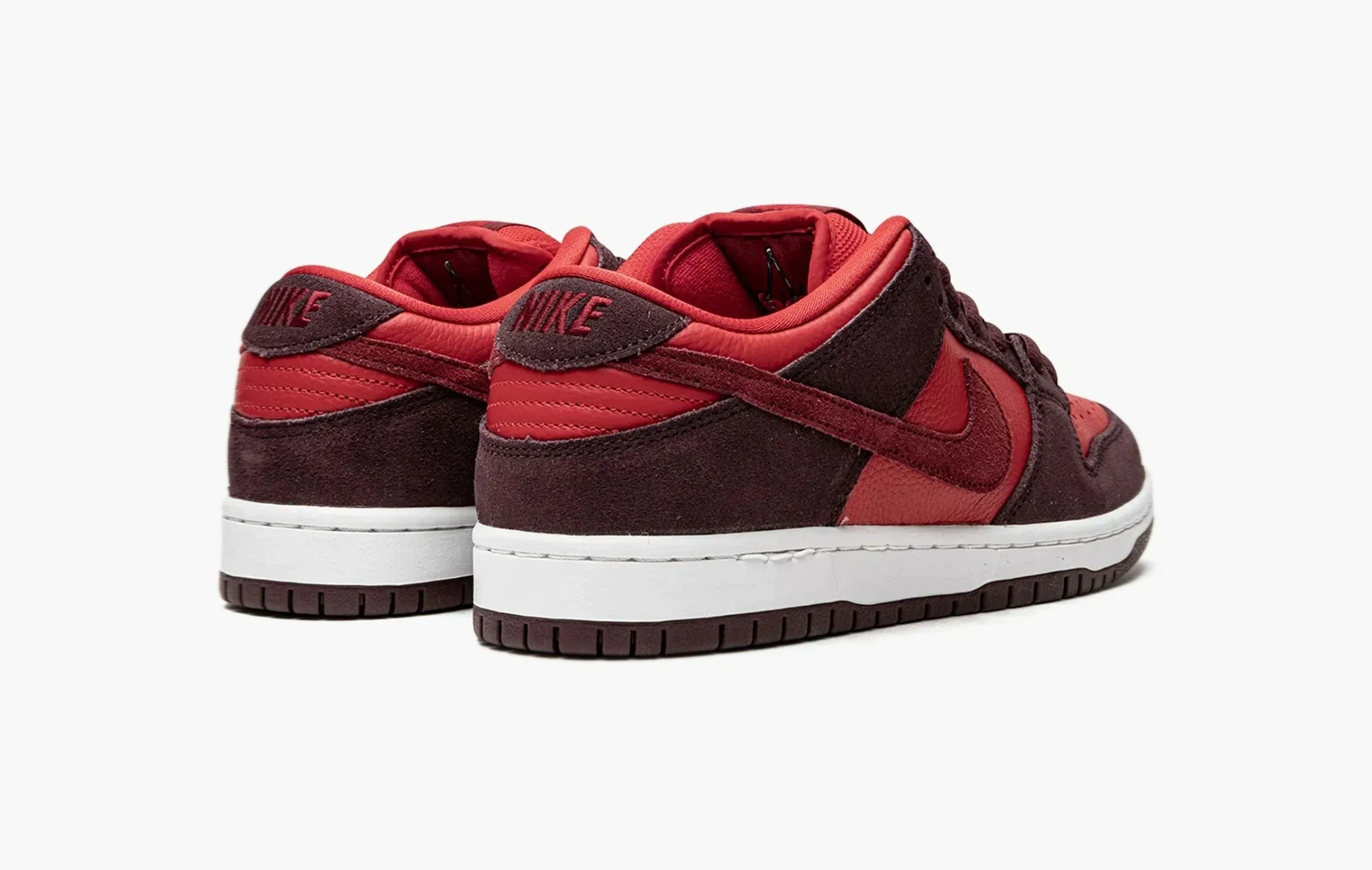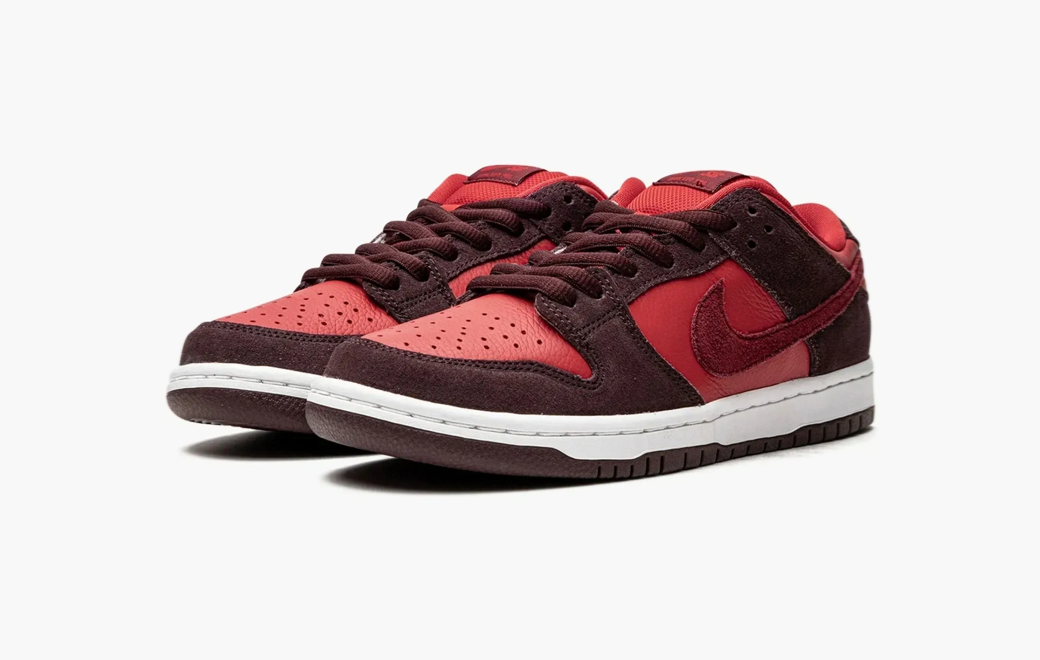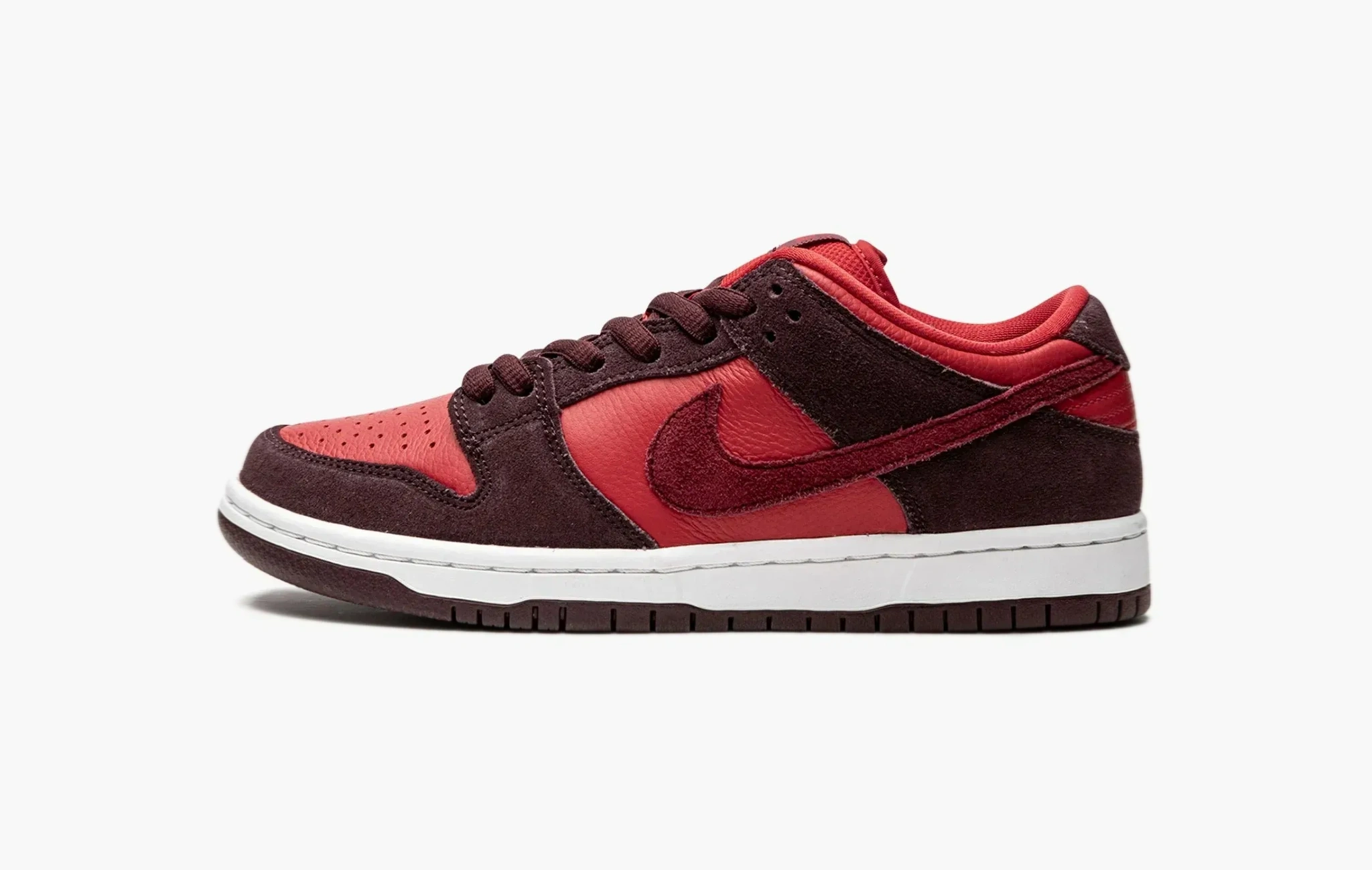 Кроссовки SB Dunk Low "Cherry", созданные изначально для скейтеров, точно придутся по вкусу и любителям моды. Верхняя часть модели изготовлена из насыщенно-красной кожи и темно-коричневой замши, которые в тандеме повторяют цветовую гамму спелых вишен и обеспечивают невероятную прочность обуви. Замшевые свуши, а также логотипы "Nike" на язычках и задниках, окрашенные в тон основы, выгодно дополняют этот лаконичный, но сочный дизайн. Прочная подошва кроссовок, произведенная из резины двух цветов, гарантирует надежное сцепление с различными поверхностями, что чрезвычайно важно при занятии скейтбордингом. SB Dunk Low "Cherry", разработанные корпорацией Nike, поступили в продажу в июне 2022 года.
