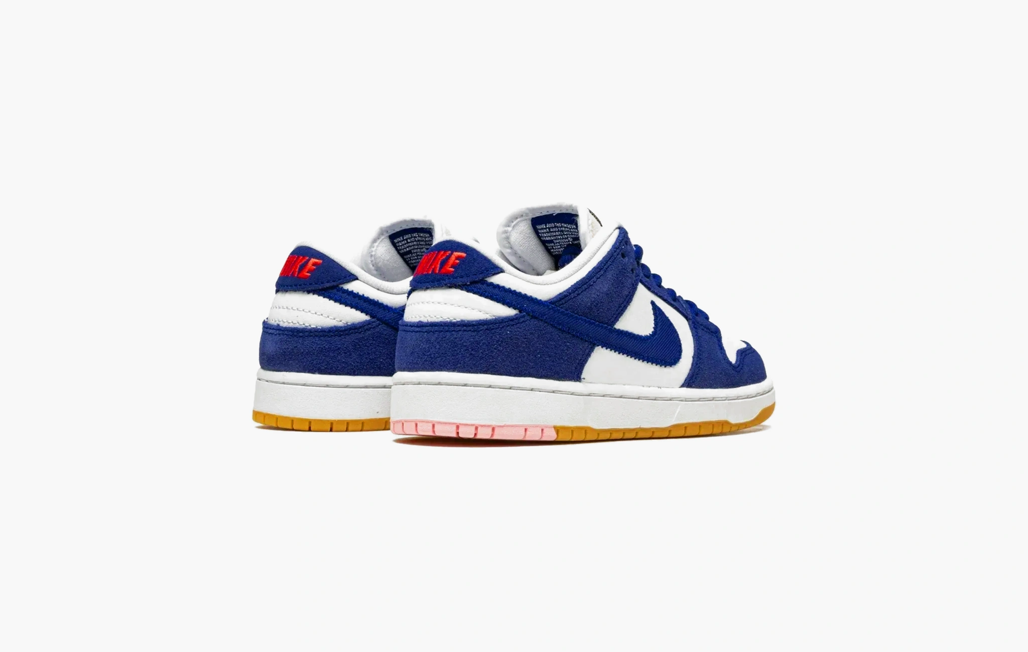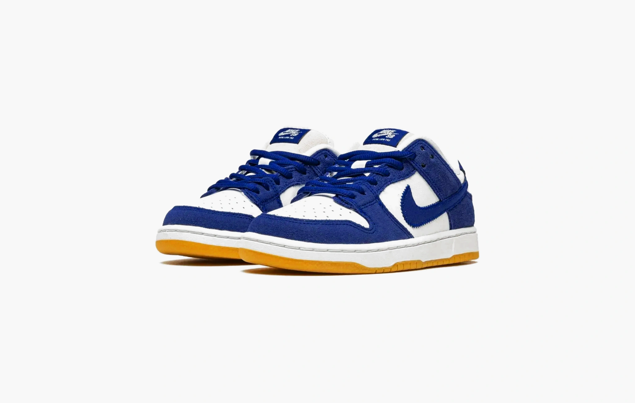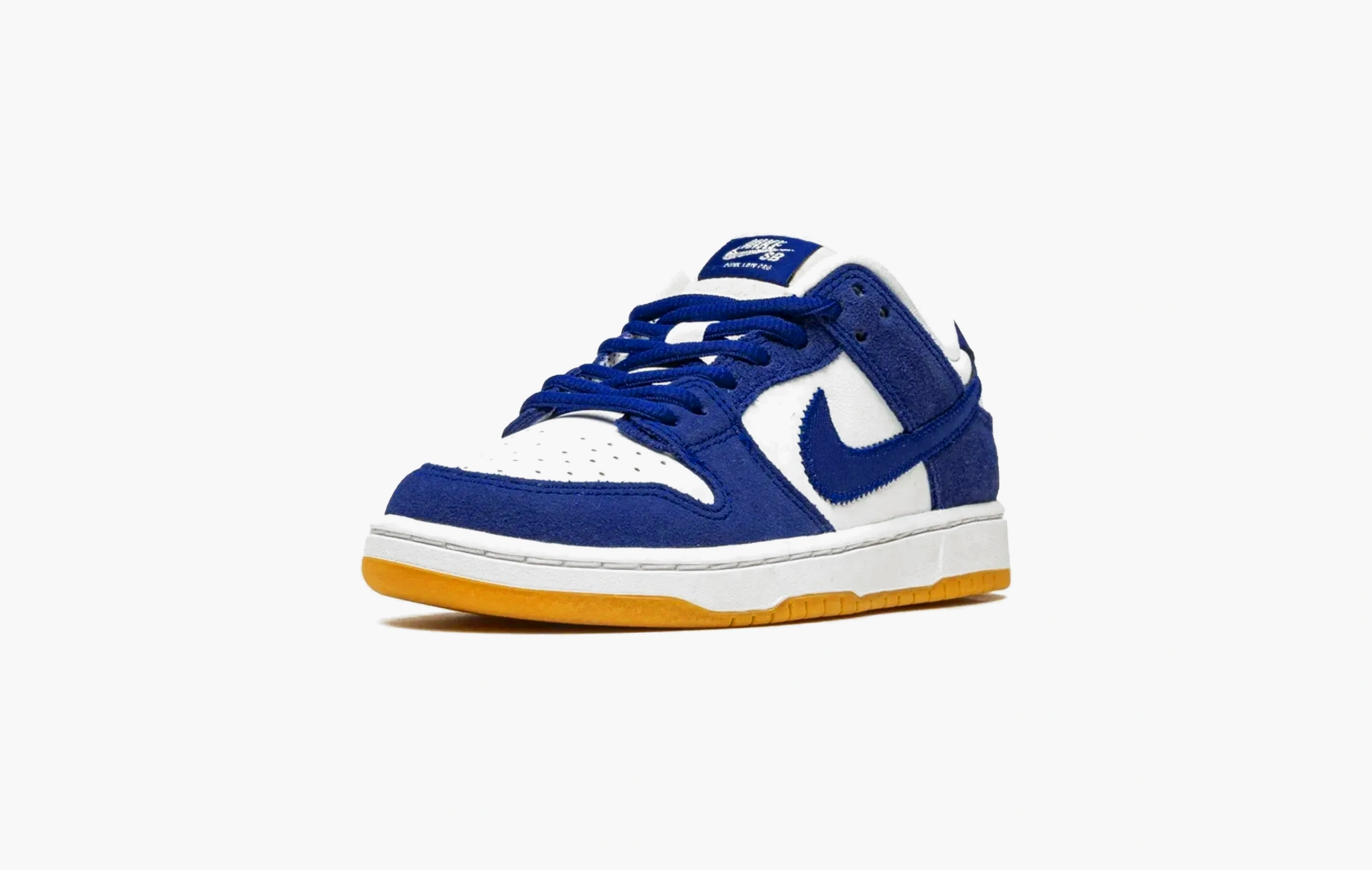 Подростковая (детская) вариация кроссовок Nike SB Dunk Low Pro “Dodgers”. По названию можно догадаться, что релиз посвящён популярному бейсбольному клубу Los-Angeles Dodgers. Цветовая гамма повторяет цвета формы спортивной команды. Верх выполнен из синей замши и белых кожаных вставок. Свуш из синтетического материала прошит по контуру, что напоминает вышивку на джерси бейсбольной лиги. Белая подошва дополнительно украшена классическим гамсолом.